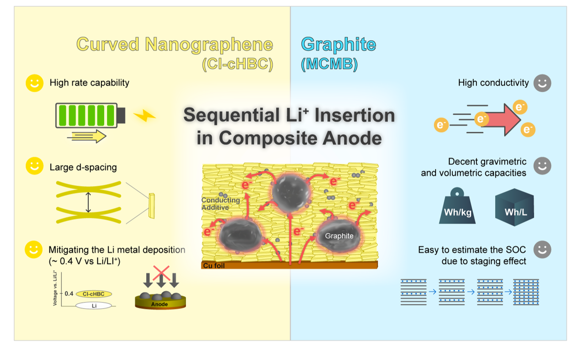 연구팀이 개발한 하이브리드 음극은 이러한 문제를 해결할 수 있는 구조로 설계됐다. 상용 음극 소재인 흑연 입자(MCMB)가 곡면 나노그래핀(Cl-cHBC) 적층 안에 고르게 분포된 형태다. 활처럼 비틀린 형태의 곡면 나노그래핀은 적층 시 층간 간격이 넓고 나노 크기의 공간이 많아 리튬이온이 드나드는 속도가 빠르다.