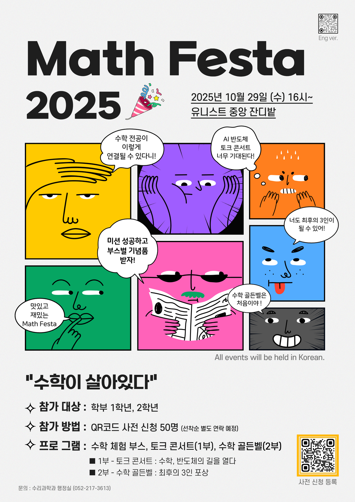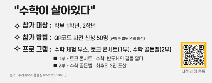 이번 행사는 학부생 누구나 참여 가능하다. 참가자들은 다양한 체험 부스와 강연, 퀴즈 이벤트를 즐기며 수학의 원리를 직접 느끼고, 학문이 산업과 기술로 이어지는 과정을 이해할 수 있다. 참여는 포스터에 안내된 온라인 링크에서 사전 신청하면 된다.