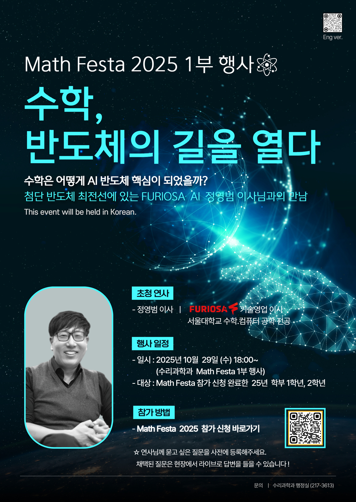 김 학과장은 “이번 ‘Math Festa’는 학생들이 수학을 단순한 문제 풀이가 아닌, 현실과 미래를 여는 도구로 바라보는 계기가 되길 바란다”며 “흥미로운 활동과 실질적인 강연을 통해 수학과 AI, 산업 간의 연계성을 경험할 수 있을 것”이라고 전했다.