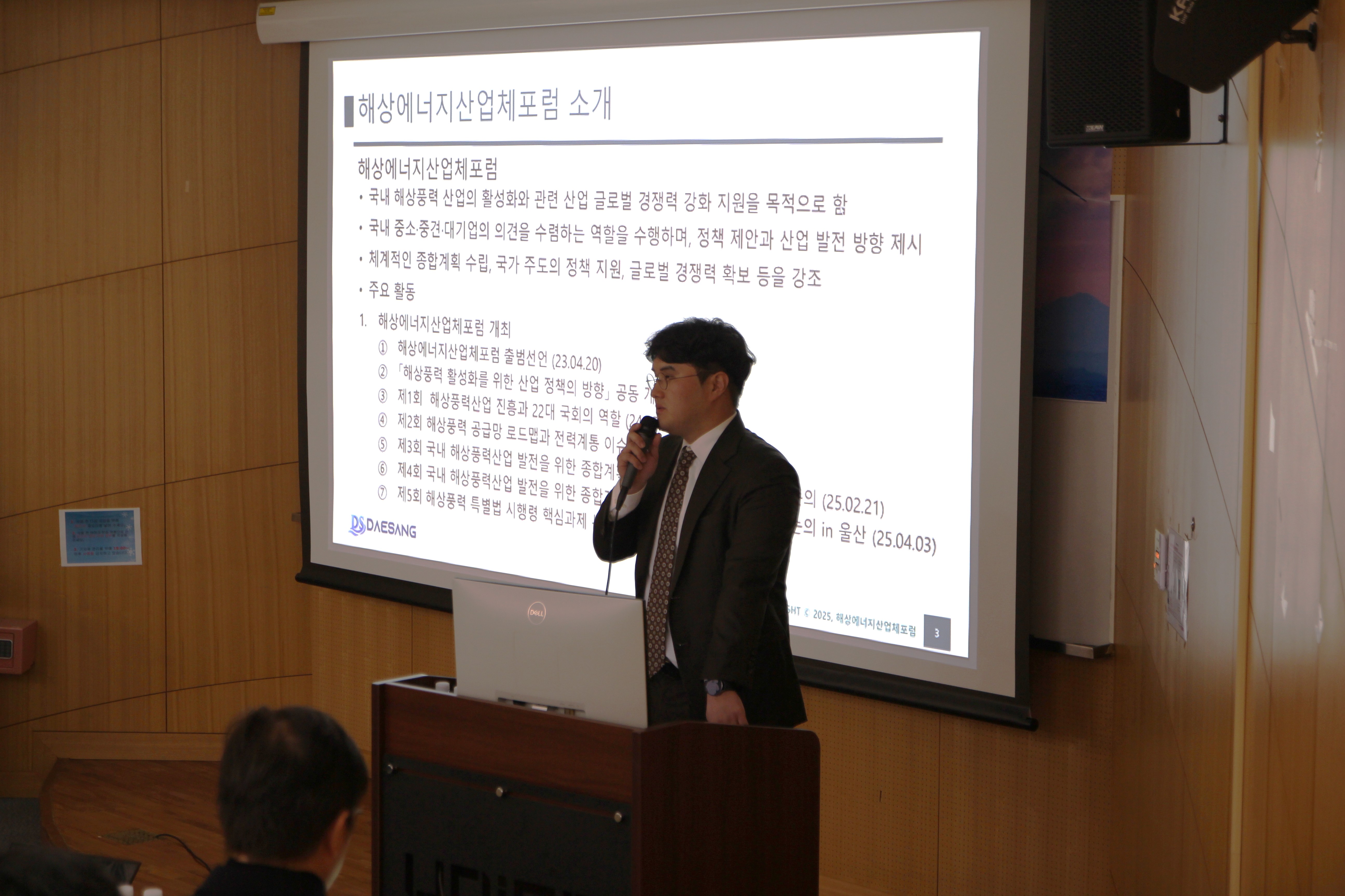 이어 김웅욱 문무바람 상무는 ‘울산 부유식 해상풍력의 실현 경로’ 발표를 통해 울산 지역 부유식 해상풍력 사업의 추진 현황과 한계를 설명했다. 그는 정책 및 제도 불확실성, 공급망 리스크, 지역 수용성 문제를 주요 과제로 제시하며, 해상풍력이 울산의 조선·해양·에너지 산업 전반을 저탄소 미래 산업으로 전환하는 핵심 프로젝트라는 점을 강조했다.