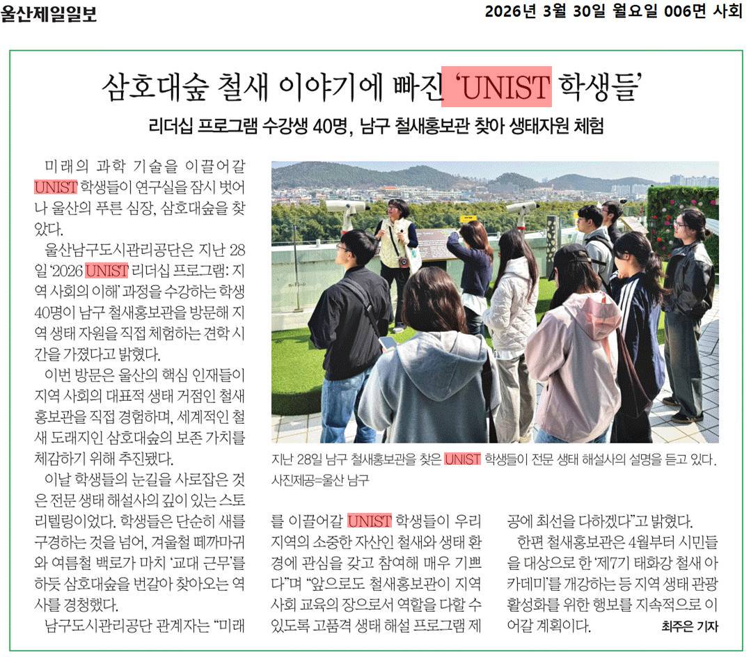 프로그램에 참여한 한 학생은 “울산이 단순한 산업도시가 아니라, 생태와 역사가 함께 살아 숨 쉬는 공간이라는 점을 새롭게 인식하게 됐다”고 말했다. 또 다른 학생은 “학교 주변 풍경이 철새들의 중요한 서식지라는 설명을 듣고 완전히 다르게 보이기 시작했다”며 “강의와 답사가 연결되면서 지역을 이해하는 방식이 달라졌다”고 소감을 전했다.