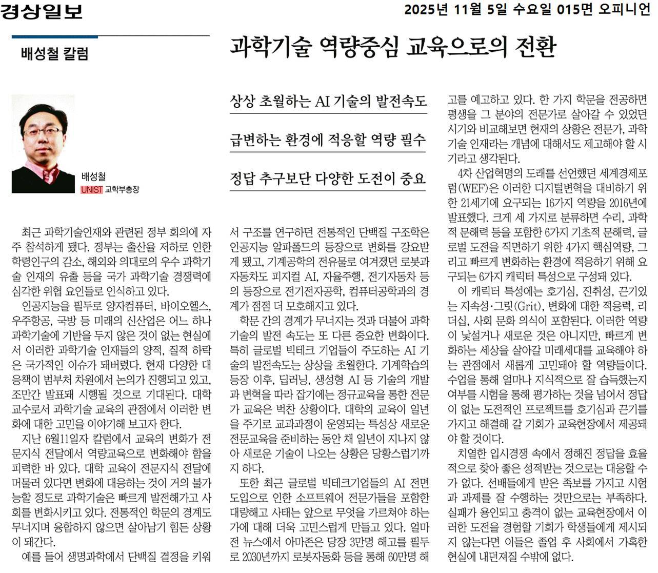 <본 칼럼은 2025년 11월 5일 경상일보 “[배성철 칼럼]과학기술 역량중심 교육으로의 전환”이라는 제목으로 실린 것입니다.>