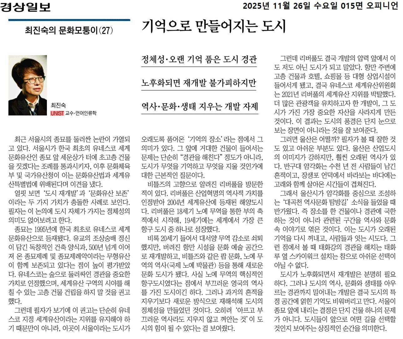 <본 칼럼은 2025년 11월 26일 경상일보 “[최진숙의 문화모퉁이(27)]기억으로 만들어지는 도시”라는 제목으로 실린 것입니다.>