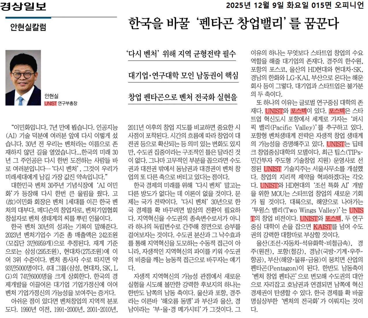 <본 칼럼은 2025년 12월 9일 경상일보 “[안현실칼럼]한국을 바꿀 ‘펜타곤 창업밸리’를 꿈꾼다”라는 제목으로 실린 것입니다.>