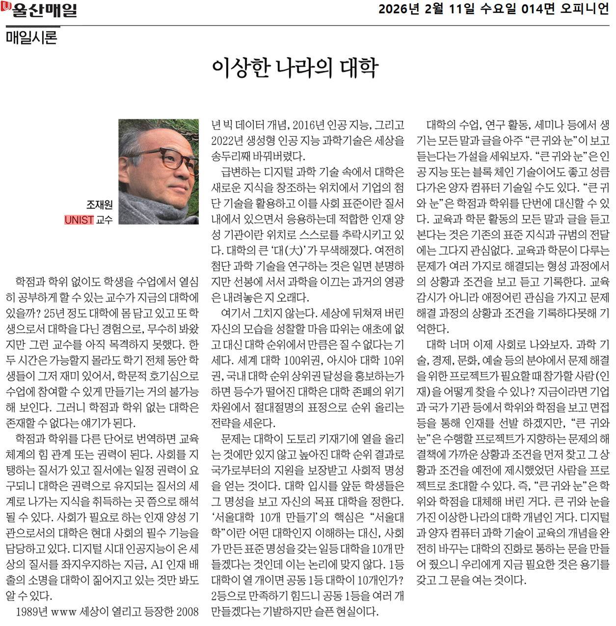 <본 칼럼은 2026년 2월 11일 울산매일 “[매일시론] 이상한 나라의 대학”이라는 제목으로 실린 것입니다.>