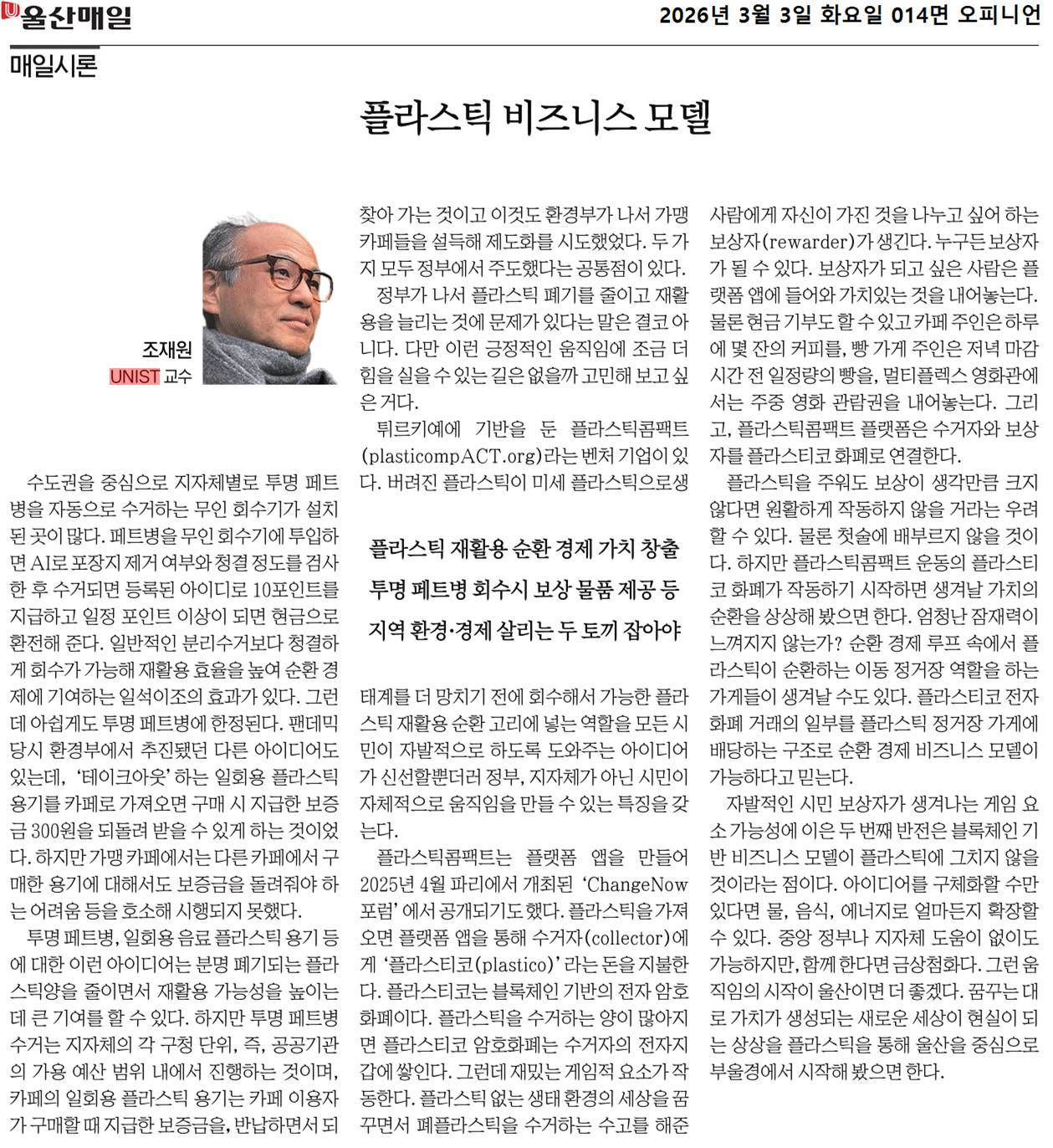 <본 칼럼은 2026년 3월 3일 울산매일 “[매일시론] 플라스틱 비즈니스 모델”이라는 제목으로 실린 것입니다.>