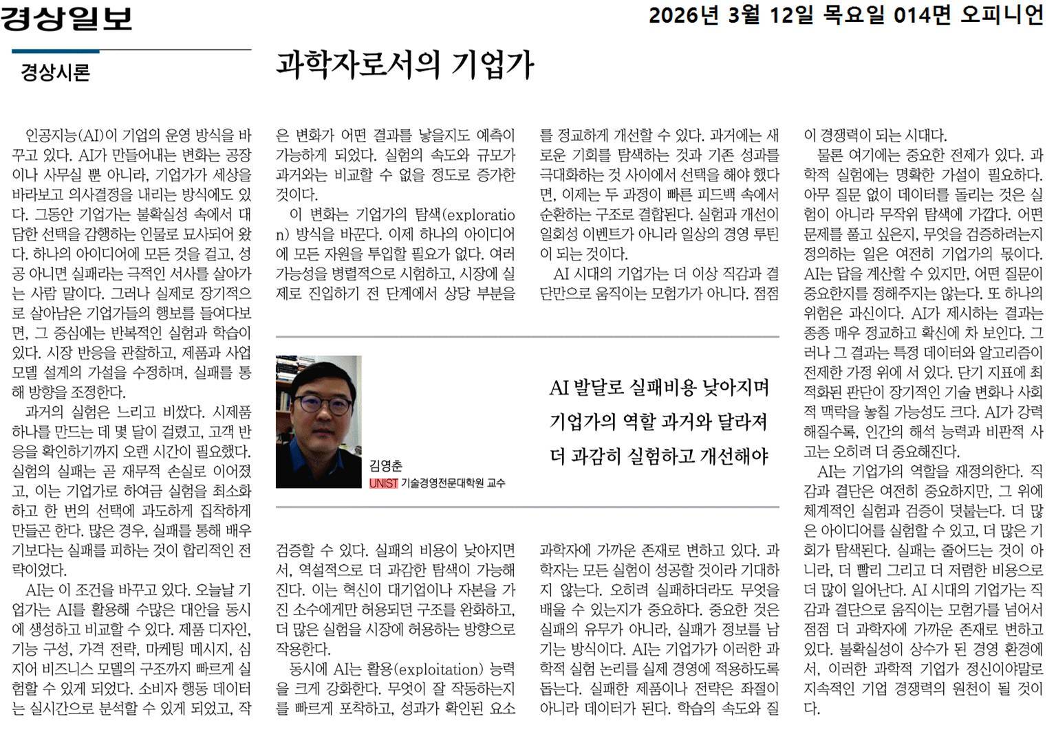 <본 칼럼은 2026년 3월 12일 경상일보 “[경상시론]과학자로서의 기업가”라는 제목으로 실린 것입니다.>