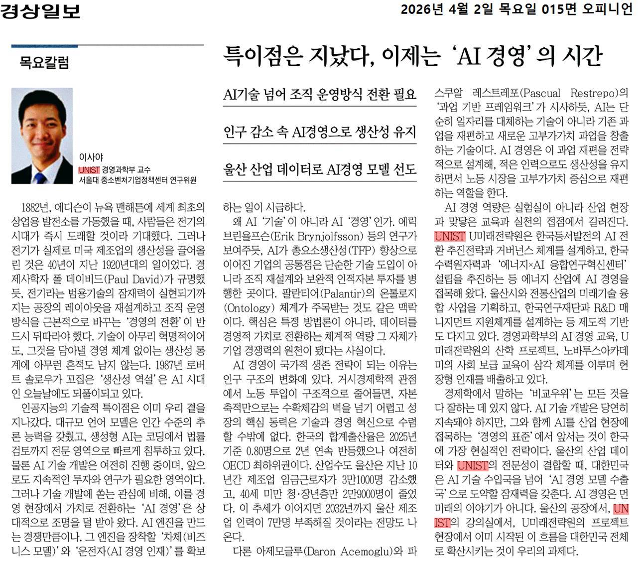 경제학에서 말하는 ‘비교우위’는 모든 것을 다 잘하는 데 있지 않다. AI 기술 개발은 당연히 지속돼야 하지만, 그와 함께 AI를 산업 현장에 접목하는 ‘경영의 표준’에서 앞서는 것이 한국에 가장 현실적인 전략이다. 울산의 산업 데이터와 UNIST의 전문성이 결합할 때, 대한민국은 AI 기술 수입국을 넘어 ‘AI 경영 모델 수출국’으로 도약할 잠재력을 갖춘다. AI 경영은 먼 미래의 이야기가 아니다. 울산의 공장에서, UNIST의 강의실에서, U미래전략원의 프로젝트 현장에서 이미 시작된 이 흐름을 대한민국 전체로 확산시키는 것이 우리의 과제다.