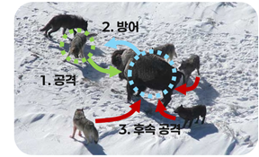 그림1. 늑대의 사냥 전략. 하나의 늑대가 먼저 먹잇감을 공격하면, 먹잇감 무리는 이에 대응하기 위해 방어 행동을 취하게 된다. 이때 나머지 늑대들이 후속 공격에 참여함으로써, 먹잇감의 방어를 분산시키고 전체적인 사냥 성공률을 높이는 전략이다.