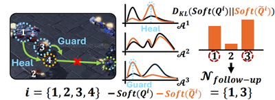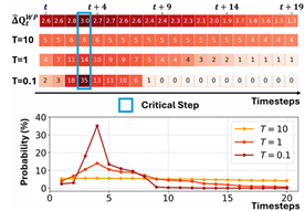 그림 3. 울프팩 어택의 공격 시점 선택 과정. Transformer 기반의 planner를 활용해 향후 공격 전후의 가치의 변화를 예측하고, 이를 바탕으로 공격 시점을 확률 분포 형태로 산출한다. 이후 이 분포를 따라 공격 시점을 확률적으로 선택하게 된다. 이때 분포가 지나치게 뾰족하면 공격 시점이 특정 시점에만 집중되어 다양성이 감소하며, 반대로 분포가 지나치게 완만하면 공격의 치명도가 떨어지는 문제가 발생한다. 따라서 효과적인 공격을 위해 적절한 분포 형태를 설계하는 것이 중요하다. |