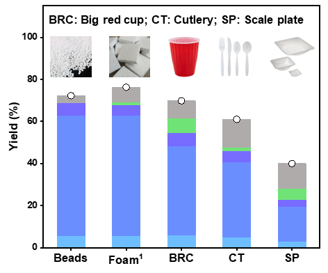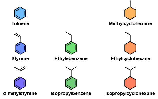 그림 3. 폴리스타이렌 열분해 및 수소화 반응에서 확인된 생성물