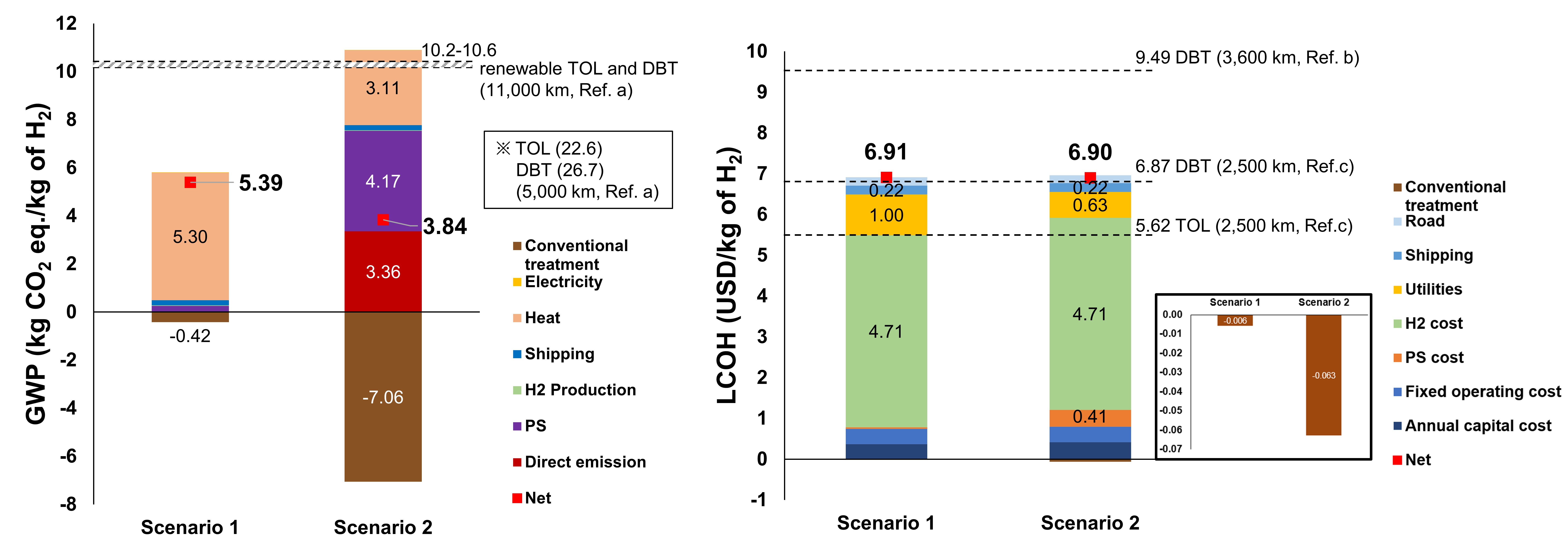 그림8. 시나리오별 이산화탄소 배출량(왼쪽) 및 비용(오른쪽) 공정 중 발생하는 잔류물을 활용해 열을 재공급하는 시스템(Scenario 2)을 적용하면, 온실가스 배출량이 수소 1kg당 3.84kg CO2 eq.으로 기존 LOHC 시스템 대비 탄소 배출이 줄어드는 것으로 나타났다. 수소 생산 단가도 kg당 약 6.9달러 수준으로, 상용화된 수소 저장·운송 시스템과 비슷하거나 낮은 수준을 기록했다. |