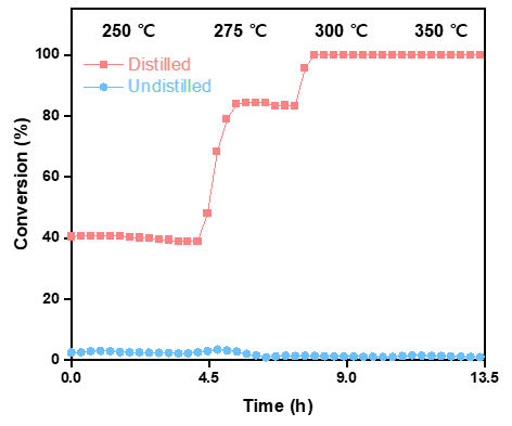 그림6. 폴리스타이렌 기반 액상 유기 수소 운반체의 탈수소화 반응(수소 분리 반응)의 전환율