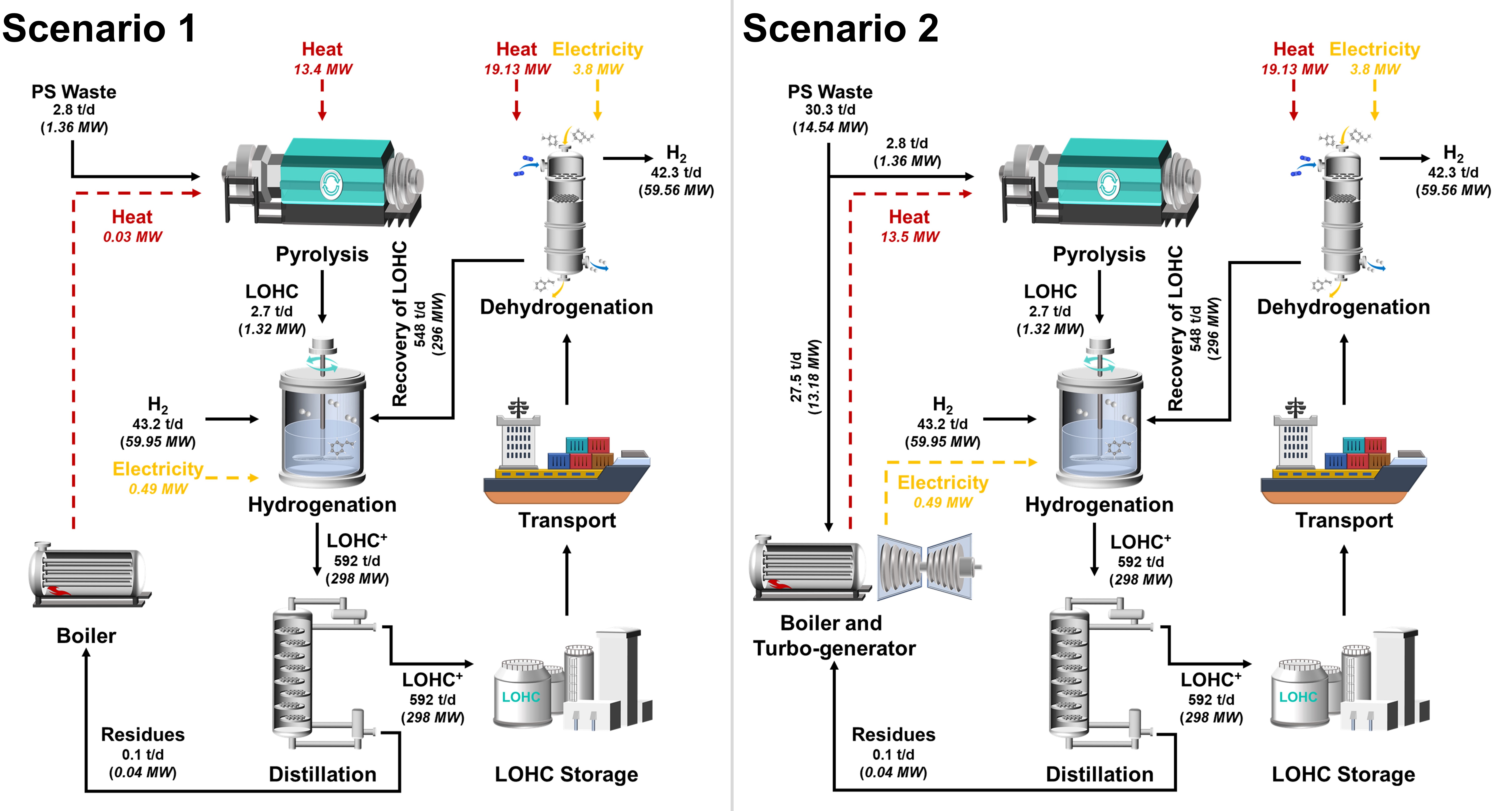 그림7. 폴리스타이렌 에너지원 활용 여부에 따른 시나리오별 공정흐름도. 시나리오2의 경우, 열분해 찌꺼기를 다시 태우는 방식으로 에너지 투입을 최소화 함.