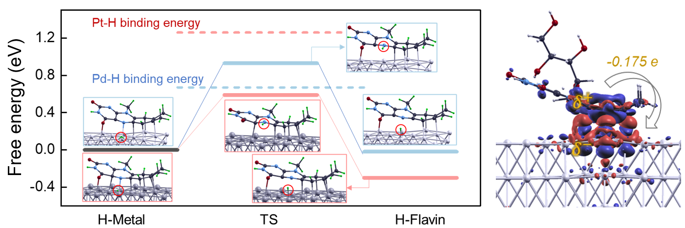 그림1. 생체 조효소 FAD를 활용한 저전압 수소 생산·저장 원리 (왼쪽) 백금(Pt) 전극에서 포름산(HCOOH)이 산화돼 이산화탄소(CO₂)와 수소이온(H⁺)이 생성되고, FAD가 수소 중간체(*H)를 제거해 전극 표면을 정리한다. 팔라듐(Pd) 전극에서는 FAD가 전자 분포를 조절해 수소이온의 흡착을 촉진하고 수소 발생 반응을 유도한다. (오른쪽) 전체 시스템 구조도. 생성된 수소가 액상 유기물(톨루엔)에 저장되는 과정을 보여줌. 그림2. 계산화학을 통한 FAD의 수소 흡착·탈착 반응 경로 규명 FAD를 전극에 입힌 경우(분홍 실선)는 기존 Pt 전극(분홍 점선)보다 수소 흡착 에너지가 낮아져 포름산 산화시 표면에 불필요하게 남아 있는 *H를 효과적으로 제거한다. (좌측 그림). 반면, Pd 전극에서는 FAD가 전자를 공급하여 H+ 흡착을 촉진함으로써 수소 생성·저장 반응을 가속화한다 (우측 그림). |