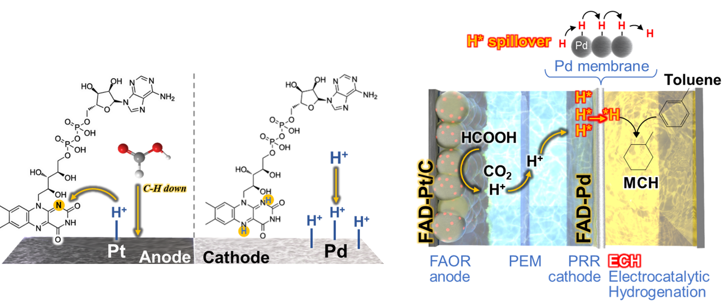 그린수소를 더 값싸게 생산할 수 있는 기술이 나왔다. 생체 에너지 대사 조효소를 이용해 전력 소모를 줄인 기술이다. 만든 수소는 기체 상태를 거치지 않고 곧장 액상 유기물에 저장할 수 있어 수소 생산 비용 뿐만 아니라 저장·운반 비용까지 줄일 수 있을 것으로 기대된다. UNIST 에너지화학공학과 송현곤 교수팀은 생체 조효소 FAD를 전극 표면에 입혀 저전압으로 수소를 생산하고 이를 바로 액상 유기물에 저장할 수 있는 전기화학 시스템을 개발했다고 26일 밝혔다. 이 시스템은 백금(Pt) 전극과 팔라듐(Pd) 전극으로 구성돼 있다. 백금 전극에서 포름산(HCOOH)이 산화돼 나온 전자가 반대편 팔라듐 전극의 수소이온(H⁺)과 만나 수소(*H)를 만든다. 이때 만들어진 수소는 팔라듐 금속막을 그대로 통과해, 그 뒤편의 액상 유기물 속에 저장된다. 연구팀은 FAD 조효소를 양쪽 전극에 입혀 반응 효율을 높이고 수소 생산을 위한 전기 소모를 줄였다. 실제 수소 생산·저장 시 시스템의 전압을 측정했을 때 약 0.6V의 낮은 셀 전압을 기록했다. 기존 보다 약 65% 감소한 수치다. 수명도 기존 대비 8배 늘어나 100시간 이상 연속 작동에서도 성능 저하가 없었다. 셀 작동 전압이 높을수록 전력 소모가 많고 수명이 준다. 기체 상태 수소를 액상 유기물에 주입하는 별도 공정이 필요 없는 것도 이 기술의 장점이다. 제 1저자인 이지수 연구원은 “액상 유기물에서 수소를 저장할 때는 기체 상태의 수소(H₂)를 고압으로 주입하거나 반응 조건을 맞추는 추가 공정이 필요한데, 이 기술은 전극에서 발생한 수소를 원자 형태(H)로 바로 액상 유기물에 저장한다”라고 설명했다. 전극에 입혀진 FAD(플라빈 아데닌 다이뉴클레오타이드)는 원래 세포 미토콘드리아에서 에너지 분자(ATP) 생산을 돕는 조효소다. 전자와 양성자(H⁺, 수소이온)를 모두 옮길 수 특성이 있다. 개발된 시스템에서 이 조효소가 양쪽 전극에 필요한 맞춤형 역할을 할 수 있는 이유다. 이 조효소는 수소가 팔라듐 전극 쪽에서는 수소 이온이 전극 표면에 더 잘 달라붙게 유도한다. 반면 백금 전극에서는 수소 중간체를 전극 표면에서 제거하는 역할을 한다. 표면에 수소 중간체가 남아 있으면 포름산이 접근하지 못해 반응이 지연된다. 수소가 나오는 쪽은 팔라듐 전극이지만, 백금 전극에서의 반응도 활성화돼야 전체 시스템의 전력 소모가 줄어든다. 송현곤 교수는 “생체 분자가 가진 전자·양성자 운반 특성을 전기화학 시스템에 접목해, 수소 생산과 저장을 동시에 해결할 수 있게 됐다”며 “고압 용기 없이 수소를 저장하는 새로운 방법을 제시함으로써, 안전하고 효율적인 수소 활용 기술의 토대를 마련한 연구”라고 설명했다. 이번 연구 성과는 ‘응용 촉매 B: 환경과 에너지(Applied Catalysis B: Environmental and Energy)’ 에 7월 2일자로 온라인에 게재됐다. 연구 수행은 UNIST 하이드로 스튜디오(hydro*studio)의 이노코어(InnoCore) 프로그램과 산업통상자원부, 한국산업기술평가관리원, 한국연구재단(NRF)의 지원을 받았다. (논문명: FAD-mediated modulation of hydrogen adsorbates for low-voltage hydrogen production and hydrocarbon hydrogenation) |