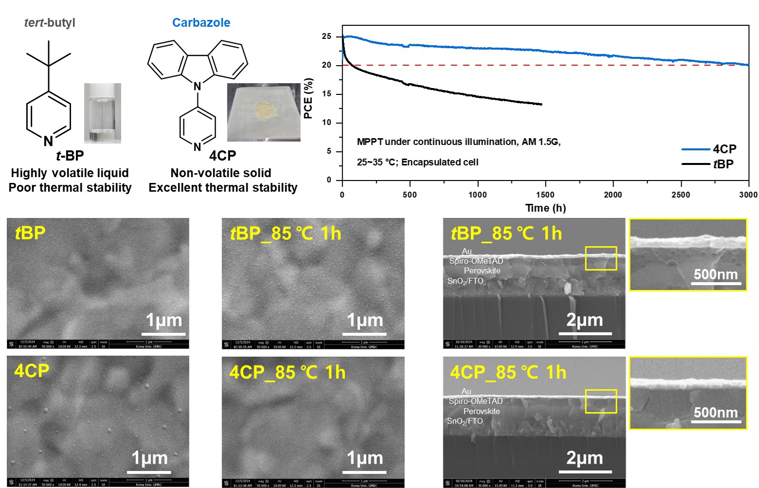 그림설명. 개발된 고체 첨가제의 화학구조와 성능 (상단 좌측) 기존 액상 첨가제 tBP와 새로 개발된 고체형 첨가제 4CP의 화학 구조와 특성 비교를 보여준다. tBP는 휘발성이 강해 열 안정성이 떨어지지만, 4CP는 고체 상태로 휘발하지 않아 열에 강하다. (상단 우측) 그래프는 장기 구동 시험 결과로, 4CP를 적용한 태양전지가 3000시간 이상 초기 효율의 80%를 유지했지만 tBP 기반 전지는 1,000시간 이내에 성능이 크게 저하됐다. (하단) 열처리 후 전극 표면과 단면을 비교한 것으로, tBP 전지는 핀홀이 생기고 층이 불균일해진 반면, 4CP 전지는 매끄러운 표면과 균질한 층 구조를 유지하는 것이 확인됐다. |