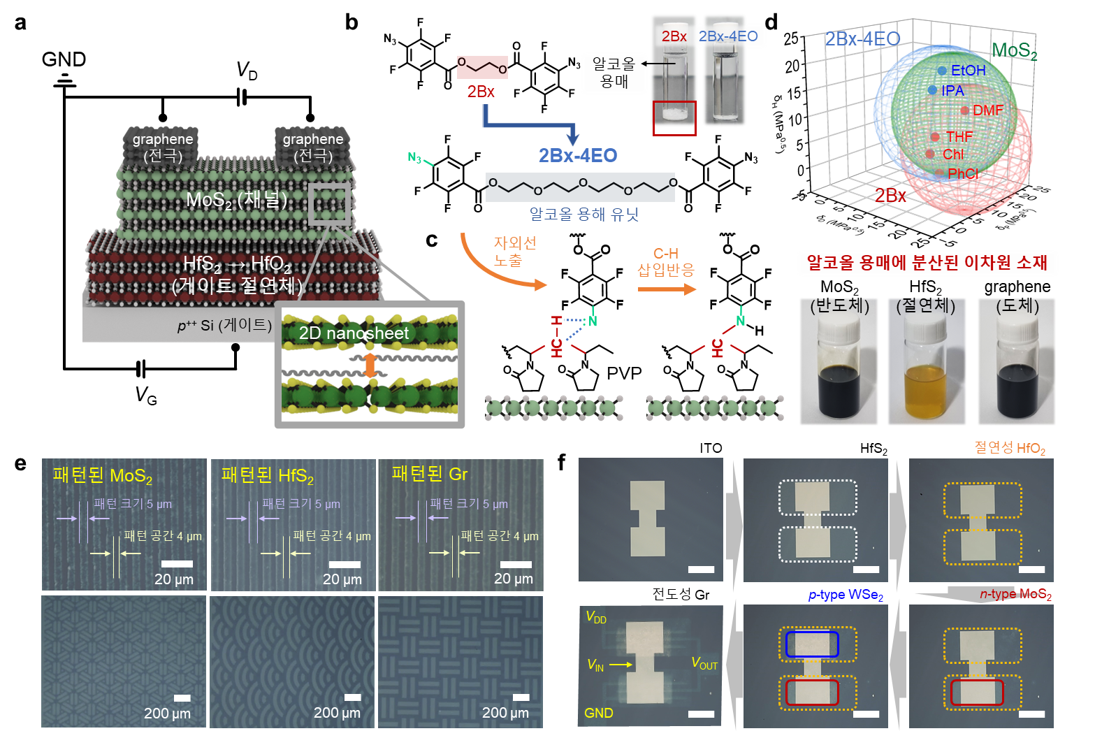그림1. 친환경 용매 기반 2차원 반도체 소재의 직접 패터닝 공정과 해당 공정으로 제작된 반도체 소자 (a) 개발된 공정으로 제작된 2차원 반도체 소자(전계효과 트랜지스터)의 구조 (b) 알코올계 친환경 용매에 높은 용해도를 갖도록 설계된 친환경 2Bx-4EO 가교제의 화학 구조. (c) C-H 삽입 반응을 통한 2차원 나노소재의 광가교 반응 메커니즘 (d) 정량(Hansen solubility parameter) 분석을 통한 친환경 용매 시스템 설계 (e) 2차원 나노소재의 고정밀 패턴화 (f) 가교제 도입을 통한 이차원 나노소재 기반 전자소자 제작 공정 흐름도, 스케일 바: 400 µm. |