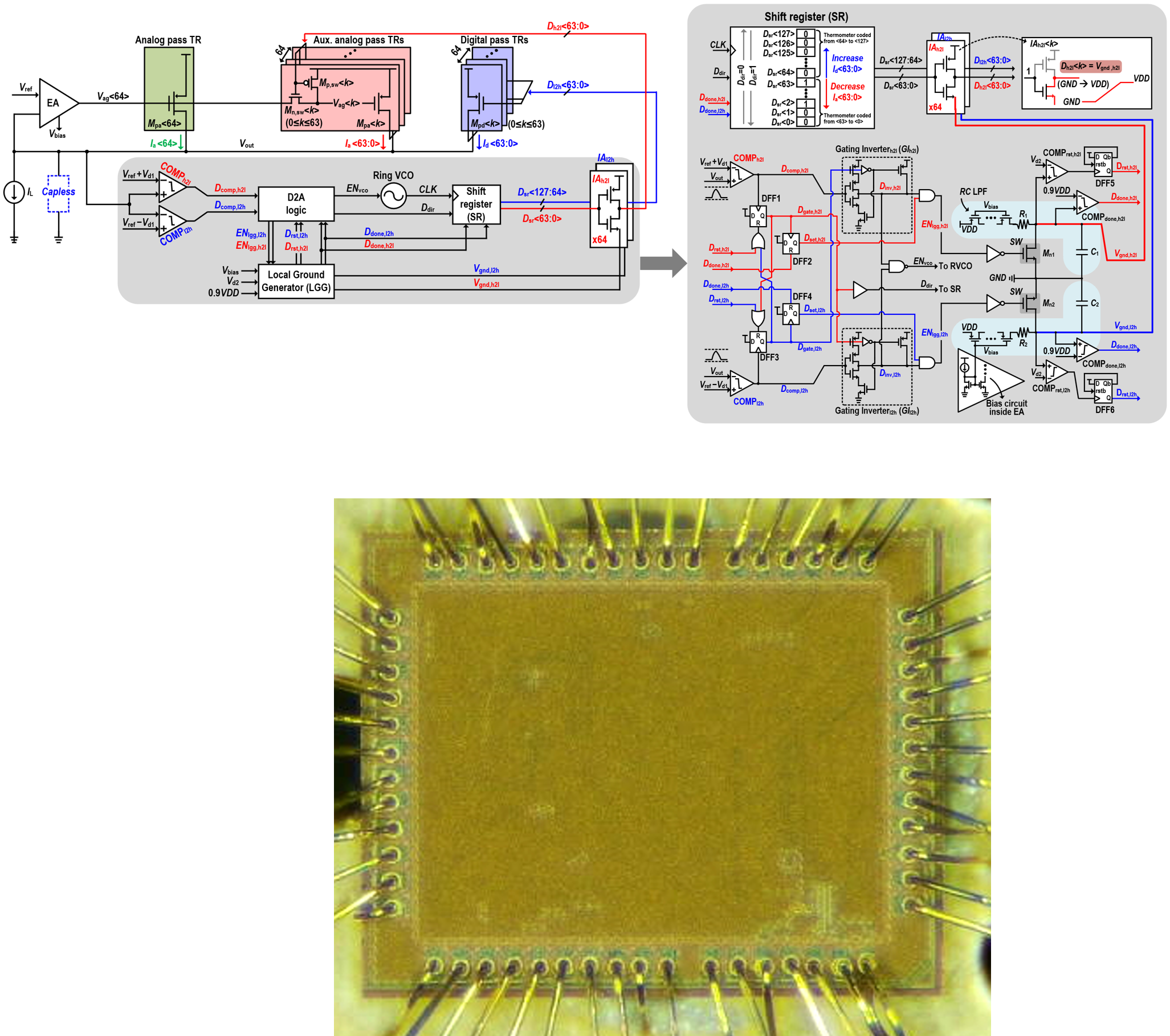 연구그림. 개발된 LDO 회로의 구조와 실제 LDO를 칩 형태로 패키징한 이미지. 아날로그 회로 구조를 기반으로 하되, 디지털 구조를 접목해, 전압 안정화와 잡음 억제 성능을 모두 확보했다. 또 새로운 구조 설계를 적용해 기존 하이브리드 구조에서 필수적이던 대용량 커패시터를 제거하고 칩의 집적도를 높일 수 있다. |