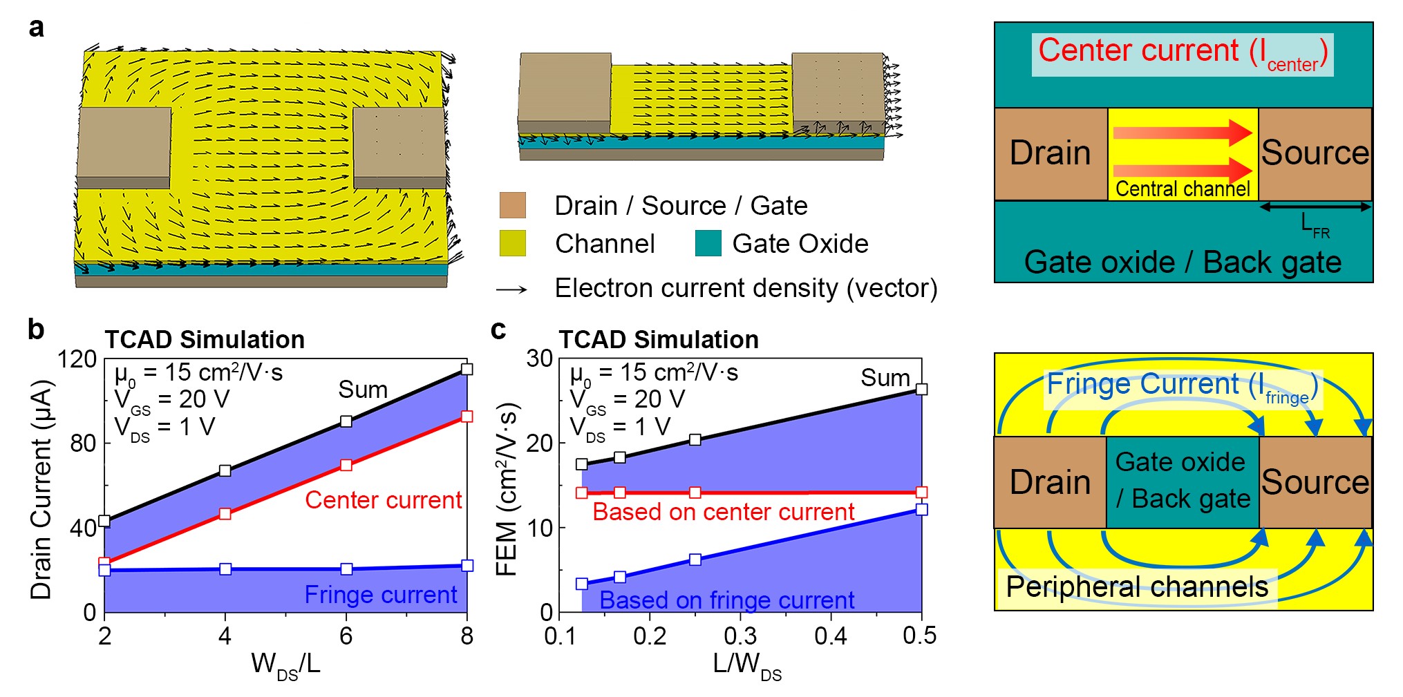 그림 2. 시뮬레이션을 통한 프린지 전류 분석 박막 트랜지스터(TFT) 내 전류 흐름을 TCAD 시뮬레이션으로 분석한 결과이다. 총 드레인 전류는 전극 사이의 중심부를 흐르는 전류(Center current)와 채널 주변부로 넓게 퍼져 흐르는 프린지 전류(Fringe current)의 합으로 구성된다. 프린지 전류는 소자 구조가 변해도 그 양이 거의 일정하지만, 이 값이 전체 성능 계산에 포함되면서 전하 이동도(FEM)가 과대평가되는 직접적인 원인이 됨을 보여준다. |