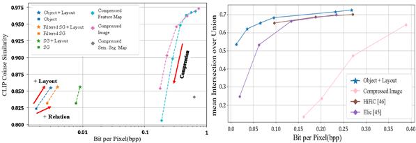 그림 4. 전송하는 의미 정보에 따른 태스크 성능 비교 결과 (왼쪽) 전송된 시각 의미 유형에 따라 비트당 전송 효율(bit-per-pixel, bpp)과 의미 유사도가 어떻게 달라지는지를 비교한 성능 그래프. 기존 압축 이미지(JPEG 등)는 전송 비트수가 낮아질수록 의미 유사도가 급격히 떨어지는 반면, 본 연구에서 제안한 방식은 훨씬 적은 비트로도 높은 의미 유사도를 유지한다. 특히, ‘Filtered SG + Layout’ 방식은 JPEG 전송 대비 약 45배 더 적은 비트로 유사한 의미 정보를 전달할 수 있는 것으로 나타났다. 이 결과는 태스크 중심 의미 선택의 효율성을 수치적으로 입증한다. (오른쪽) 이 그림은 객체 탐지(Detection) 과제 수행 시, 전송된 의미 정보의 종류에 따라 탐지 성능(mIoU) 이 어떻게 달라지는지를 비교한 결과이다. 기존 연구 방식들은 이미지 자체를 압축 전송하거나, 전체 이미지 복원을 거친 뒤 탐지를 수행하므로 전송량은 많지만 성능은 불안정했다. 반면, 본 연구에서 제안한 전송 방식(파란색)은 이미지를 복원하지 않고도 바로 탐지 성능을 확보할 수 있어, mIoU 기준 기존 대비 우수하거나 유사한 성능을 유지하면서도 전송 지연을 획기적으로 줄이는 데 성공했다. 이 그림은 제안한 과제 직행형 의미통신의 현실 적용 가능성을 뒷받침하며, 특히 실시간 산업용 비전 시스템, 자율주행 차량의 인식 시스템 등에서의 응용 가능성을 높여준다. |