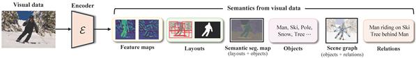 그림 1. 하나의 이미지로부터 추출 가능한 다양한 시각 의미 정보의 종류 시각 의미 정보는 객체 목록, 장면 그래프, 시맨틱 세그멘테이션(Semantic Segmentation Map), 레이아웃(Layouts), 특징 맵(Feature Map) 등이 포함되며, 각각은 서로 다른 컴퓨터 비전 과제를 해결하기 위한 입력으로 사용될 수 있다. 예를 들어, 간단한 분류(classification)에는 객체 정보만 필요하지만, 이미지 생성(image generation)과 같은 복잡한 과제에는 관계 정보와 공간 정보까지 포함된 ‘장면 그래프’와 ‘레이아웃’이 필요하다.