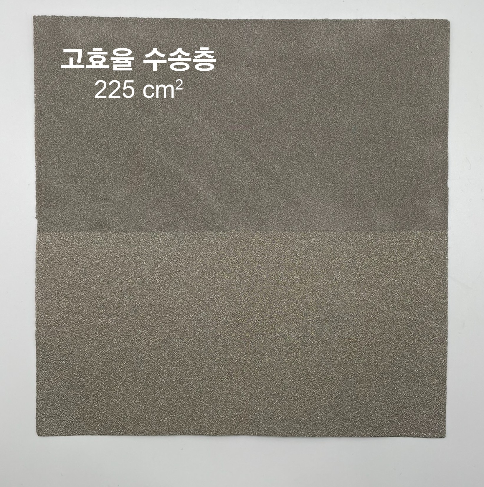 3.기대효과 이번에 개발한 AW-PTL 전극은 산업 현장에서 사용되는 공정과 재료를 바탕으로, 225 cm2 규모의 대면적 전극을 손쉽게 제조할 수 있는 기술로 구현되었다(그림4). 복잡한 미세가공 없이도 균일한 전극 제조가 가능해 대량 생산과 상용화에 적합하다. 또한 본 기술은 수전해 전반적인 반응에 모두 적용 가능한 범용성을 가진 플랫폼으로, 수전해 시스템의 수소 및 산소 전극 모두에서 반응 효율을 향상시킨다. 이를 통해 그린수소 생산과 탄소중립형 에너지 인프라 구축에 기여할 수 있을 것으로 기대된다.
