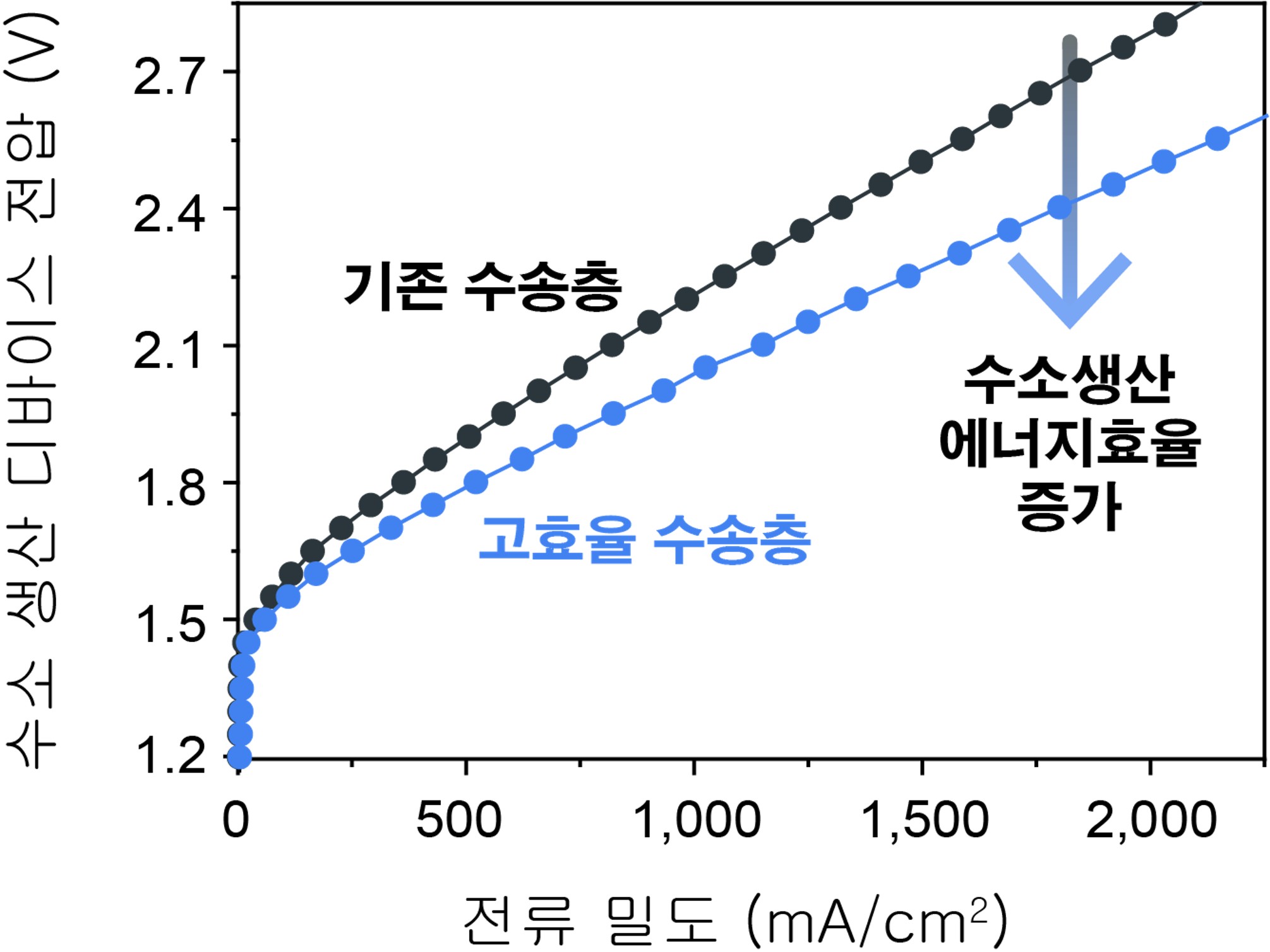 그림2. 수송층 종류별 수소 생산 시스템의 성능 비교. 개발된 수송층을 적용한 경우, 동일 전압에서 전류밀도가 최대 1.4배 향상하여 수소 생산 속도가 향상되었다. 이는 전극 표면의 기체 축적이 억제되고 전해질 공급이 원활해진 결과로, 전체 에너지 효율이 개선되었음을 보여준다. |