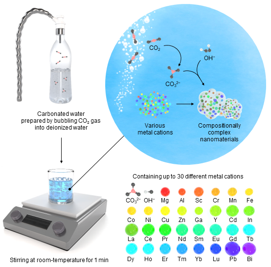 그림설명. 탄산수를 이용해 30가지의 금속원소를 포함한 나노물질이 형성되는 과정을 보여주는 모식도 CO2가 용해된 탄산수에서 pH 조절을 통해 생성된 탄산 이온과 다양한 금속 양이온이 빠르게 반응하여 초다성분 탄산염–수산화물 나노소재가 형성되는 전체 합성 과정을 개념적으로 보여주는 그림이다. 이 메커니즘을 통해 상온·대기압 조건에서 최대 30종의 금속이 균일하게 혼합된 나노구조를 1분 이내에 형성할 수 있다. |