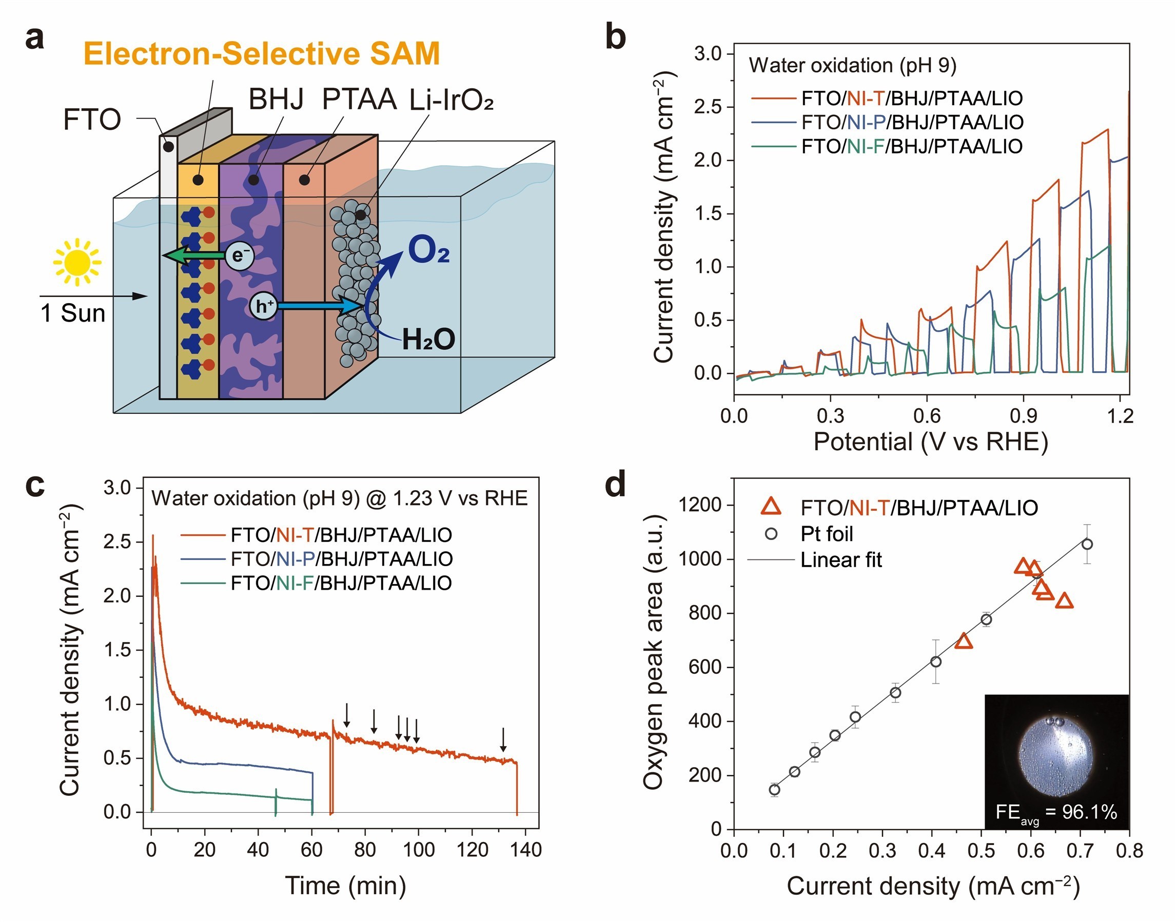 그림 4. SAM 기반 유기 광양극의 물 산화 반응 (Oxygen evolution reaction, OER) 성능 (a) FTO 기판/SAM전자전달층 /BHJ 유기반도체/PTAA 정공전달층/LIO촉매로 구성된 최종 산소 발생 광양극 구조. (b) pH 9, OER 조건에서 측정된 광양극의 전압-광전류밀도 곡선 (LSV). 전압이 올라갈수록 산소 발생 반응이 얼마나 활발해지는지 보여준다. (c) 1.23 V vs RHE, pH 9, OER 조건에서 측정된 광양극의 시간-광전류밀도 곡선 (CA). 시간축으로 전류 변화를 보면 광양극의 안정성이 드러난다. 전류가 오래 유지될수록 실제 물 분해 반응을 오래 지속할 수 있다는 의미다. (d) 가스 크로마토그래피로 실제 생성된 산소량을 측정해, 광양극에서 흐른 전류량과 산소 발생량이 얼마나 정확히 일치하는지 비교한 결과다. NI-T SAM의 패러데이효율은 (Faradaic efficiency)는 약 96.1%로, 전류가 실제 산소 생성에 거의 다 쓰였다는 것을 의미한다. |
