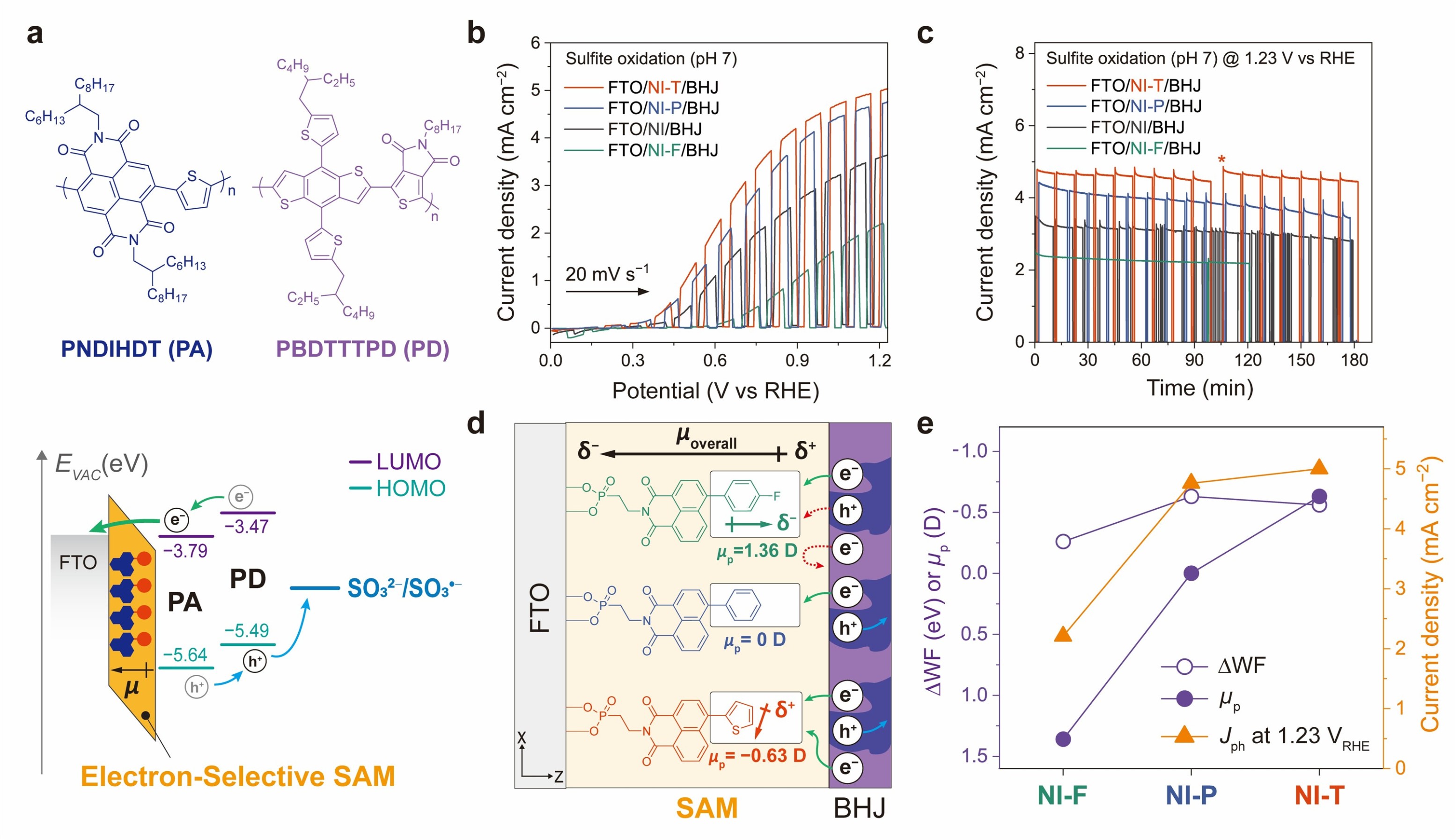 그림 3. 푸시–풀 SAM이 유기 광전극의 성능을 끌어올리는 과정 (a) 이번 연구에 사용된 두 가지 유기 반도체(PA, PD)의 분자 구조. 이 유기물들이 광전극의 ‘빛을 흡수하는 층(BHJ)’을 구성한다. (b) pH 7 조건에서 전류–전압 곡선. SAM을 입힌 기판일수록 전자가 더 잘 빠져나와 전류 상승이 빨라진다. NI-T 분자가 가장 가파른 전류 상승을 보이며 가장 우수한 성능을 나타낸다. (c) 같은 조건에서 일정 전압을 걸었을 때의 시간–전류 그래프. 전류가 오래 안정적으로 유지될수록 광전극 성능이 좋다는 뜻인데, 여기서도 NI-T가 가장 높은 전류를 유지한다. (d) 푸시–풀 구조 SAM이 전자를 끌어내는 과정을 도식화한 그림. 분자 양쪽의 전하 비대칭(쌍극자)이 계면에 강한 전기장을 만들고, 그 결과 유기 반도체에서 만들어진 전자가 기판 방향으로 넘어가는 장벽이 낮아진다. (e) SAM 분자의 쌍극자 모멘트가 커질수록 기판의 일함수 변화량도 함께 증가하고, 산소 발생 전류 역시 높아지는 상관관계를 보여준다. NI-T가 가장 큰 쌍극자 모멘트를 가지고 있으며 실제 전류 밀도 성능도 가장 높다.