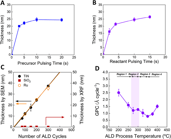 그림 1. 개발된 루테늄 전구체를 이용한 ALD 박막 증착 공정 실험 결과(A) 300 ℃에서 TiN 기판 위 전구체 펄스 시간에 따른 ALD-Ru 박막 두께, (B) O2 반응가스 펄스 시간에 따른 ALD-Ru 박막 두께 결과이다. 전구체와 O2 반응가스를 각각 10초 주입했을 때 포화 거동을 나타낸다. ALD 공정에서는 표면에서 반응 가능한 자리만을 채운 뒤 더 이상 성장하지 않아야 하며, A와 B는 개발된 전구체와 반응물이 이러한 특성을 만족함을 보여준다. (C) 기판 선택성을 보여주는 그래프이다. 최적화된 펄스 조건(전구체 주입 10초 – 전구체 퍼지 10초 – 반응물 주입 10초 – 반응물 퍼지 10초)에서 TiN 및 Ru 기판 위에서는 ALD-Ru 박막이 사이클 수에 따라 선형적으로 성장하지만, SiO2 기판에서는 Ru 박막이 성장하지 않는다. (D) 최적화된 펄스 조건에서 다양한 ALD 공정 온도에서 TiN 기판 위에 증착된 ALD-Ru GPC(Growth Per Cycle) 결과이다. 약 275–325 ℃ 구간에서 안정적인 ALD 공정 윈도우가 확인되며, 공정은 400℃까지도 적용 가능함을 보여준다 .
