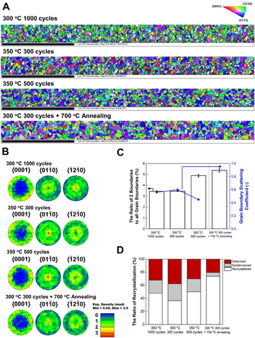 2.연구내용 연구팀이 사용한 [Ru(TMM)(p-cymene)] 루테늄 전구체는 산소를 포함하지 않는 순수 탄화수소 리간드로만 구성되어 있다. 구체적으로 trimethylenemethane(TMM)과 p-cymene(이소프로필메틸벤젠)의 두 가지 리간드가 루테늄 중심에 결합하고 있다. 산소를 포함하지 않음으로써 불순물 없는 순수 루테늄 박막 증착이 가능하며, 분자가 작고 단순해서 기판 표면에 높은 밀도로 흡착된다. 또한 루테늄 원자와의 강한 결합으로 고온에서도 안정적이면서도 높은 반응성과 자동제한적 성장 특성을 보인다. 열안정성 측면에서 기존 전구체들은 300 ℃ 이상에서는 열적 안정성이 보장되지 않았으나. 본 전구체는 400 ℃까지 안정적이어서 고온 공정으로 박막의 결정성을 개선할 수 있다. 루테늄 박막의 성장 속도는 1.28 Å/cycle이며, 인큐베이션 사이클은 약 8로 기존의 11~250 사이클에 비해 현저히 단축되어 빠르고 효율적인 생산이 가능해진다. 350 ℃ 공정에서 열처리 없이 10.6 μΩ·cm의 낮은 비저항을 달성했는데, 벌크 루테늄의 저항값 7.4 μΩ·cm에 거의 접근하는 수준으로 기존 0가 루테늄 전구체의 20~30 μΩ·cm과 비교하면 획기적인 성과다. 특히 주목할 점은 기판 선택성이다. 연구팀은 TiN 기판에는 루테늄 증착이 일어나지만 SiO2 기판에는 성장이 되지 않는 현상을 발견했으며, 이러한 100% 선택성이 1000 사이클까지 유지됨을 확인했다. 이는 기존의 영역 선택적 원자층 증착 공정 (AS-ALD)보다 우수한 성능으로, 복잡한 반도체 구조에 선택적으로 적용할 수 있다는 의미다. 단차 피복성도 95% 이상을 달성했는데, 종횡비 약 4인 나노 트렌치 구조에서 입구부터 바닥까지 거의 동일한 두께로 코팅되어 3차원 반도체 구조(3D NAND 등) 제조에 필수적인 특성을 갖추었다. 이러한 성능의 원인을 규명하기 위해 연구팀은 계산화학 분석을 수행했다. 기계학습 상호작용 포텐셜(MLIP)과 밀도범함수이론(DFT) 시뮬레이션을 통해 Ru 표면에서는 전구체가 쉽게 흡착하고 반응하며, RuO2 표면에서도 효율적인 반응이 일어나는 반면, SiO2 표면에서는 흡착이 어려워 반응이 불가능함을 확인했다. 이는 표면 에너지 차이로 인한 선택적 성장을 설명해준다. 또한 전자후방산란회절(EBSD) 분석으로 결정 구조를 규명한 결과, 큰 입자 성장과 저에너지 입계(Coincidence Site Lattice, CSL) 형성이 확인되었으며, 이러한 미세구조가 전자 산란을 최소화하여 저저항을 실현하는 핵심 요소임을 밝혀냈다.