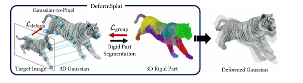 그림2. 디폼스플랫의 작동 원리 이 기술은 크게 두 단계로 작동한다. 먼저 '가우시안-픽셀 매칭(Gaussian-to-Pixel)' 과정을 통해 입력된 사진 속 픽셀과 3D 모델의 해당 위치를 연결한 뒤, , '강체 분할(Rigid Part Segmentation)' 기술을 적용해 3D 모델을 의미 있는 단위로 구분하는 방식이다. 그림 중앙의 알록달록한 호랑이는 AI가 다리, 몸통, 머리 등 움직일 때 형태가 유지되어야 하는 부위(강체)를 스스로 식별하여 그룹화한 모습이다. 이 과정을 통해 관절은 자연스럽게 굽혀지면서도 신체 부위가 고무처럼 늘어나는 왜곡을 방지하고 사실적인 움직임을 만들어낸다. |