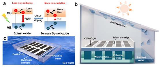 그림설명. 3원계 스피넬 산화물 기반 태양광 해수 담수화 시스템의 작동 원리와 구조 (a) 기존 망간 스피넬 산화물에서는 흡수된 빛 에너지가 방사 재결합으로 일부 손실되는 반면, 구리(Cu)와 크롬(Cr)을 치환한 3원계 스피넬 산화물(우측)에서는 비방사 재결합(non-radiative recombination)이 증가해 더 많은 에너지가 열로 전환됨. (b) 상부에는 석영 창이 설치돼 태양광을 투과시키고, 중앙에는 광열 재료가 코팅된 증발면이 위치한다. 물은 폴리에스터 스트립을 따라 증발면으로 공급되며, 증발 과정에서 소금은 가장자리로 이동해 축적된다. 발생한 수증기는 석영창에 응축돼 담수로 회수된다. (c) 해수 정화를 위한 확장형 부유식 장치. |