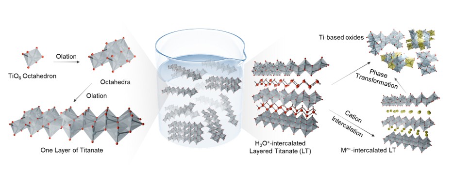 그림 1. 층상 티타네이트 합성 원리 및 이를 이용한 나노구조체 합성 과정 모식도 2차원 층상구조 형태로티타네이트가 합성되는 과정 (좌측)과 층상 티타네이트에서 파생된 티타늄 기반 나노구조체 합성 (우측). 용액 이온 교환법을 통해 손쉽게 금속 양이온을 고르게 층상 티타네이트 층간에 삽입할 수 있음. 층상 티타네이트 및 금속 이온이 포함된 구조체를 간단한 열처리를 통해 전구체로서의 활용 가능성을 확인함.