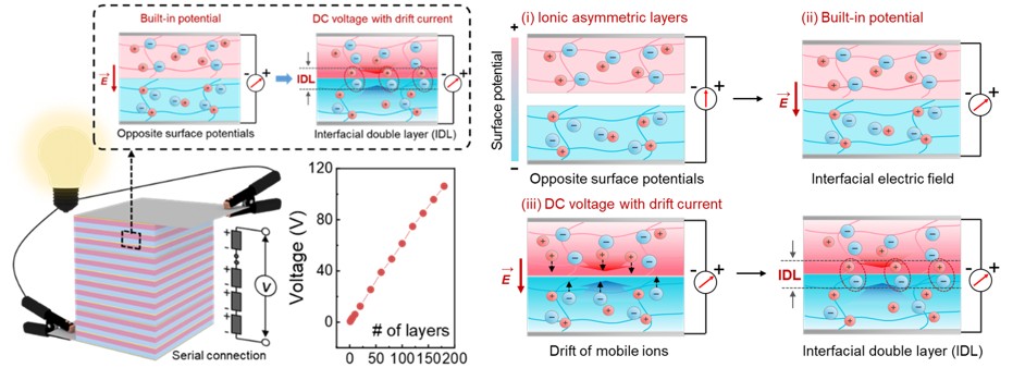 그림1. 전기 가오리를 모방한 적층형 이온 전기셀 구조 (우측) 양전하층(위쪽)과 음전하층(아래쪽)이 맞닿을 때 내부 전기장이 형성되는 과정을 단계별로 보여준다. 전기장은 고분자 내부의 이온을 한쪽으로만 이동시키고, 이동한 이온이 계면에 쌓여 전압을 일정하게 유지한다 (좌측 하단) 단위 전기셀(이온 이중층 이종접합 기반 무자극 에너지하베스터, BIAS)을 전기 가오리의 전기세포처럼 같은 방향으로 적층할 때 전압이 직렬로 더해지는 원리를 나타낸다. 층 수가 늘어날수록 전압이 선형적으로 상승하며, 적층 구조 전체에서 안정적인 직류 전압을 얻을 수 있다