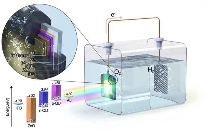 그림설명. 고가의 희생제 없이도 수소를 생산하는 금속 황화물 기반 광전극 산화 광전극은 황화물(PbS) 반도체 양자점을 액체 금속인 필드 메탈과 니켈 포일로 캡슐화한 형태다. 빛이 광전극에 닿으면 양자점 층에서 전하(양전하인 정공, 음전하인 전자)가 만들어진다. 이 가운데 정공은 필드 메탈을 거쳐 니켈 포일로 이동하고, 니켈 표면에서 물을 산소로 바꾸는 반응이 일어나 산소가 발생한다. 전자는 외부 회로를 따라 반대쪽 전극으로 이동해 물을 수소로 바꾸는 반응에 참여하며 수소가 생성된다.좌측 하단의 에너지 준위 도식은 광전극 내 각 층이 전하를 어떤 방향으로 전달하는지를 보여준다. 필드 메탈과 니켈로 이루어진 캡슐화 구조는 물의 침투를 막으면서도, 전하가 각 층을 따라 자연스럽게 이동할 수 있는 통로를 제공한다. |