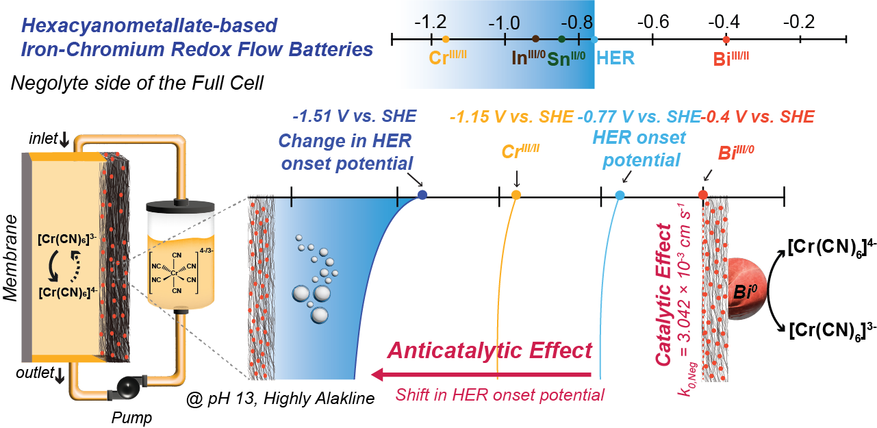 그림설명. 비스무트의 크롬 반응 속도 향상과 부반응 억제 효과 크롬 레독스 반응이 수소 발생 반응(HER)과 경쟁하는 전위 영역에서, 비스무트는 전하 전달 속도를 높이면서 HER의 시작 전위를 더 음의 방향으로 이동시켜 부반응 줄인다. 반면 주석과 인듐은 레독스 반응 속도 향상 효과는 크지 않지만, 수소 발생 반응을 억제하는 역할을 한다. 비스무트가 가장 균형 잡힌 선택적 반응 조절자 역할을 수행함을 알 수 있다. |