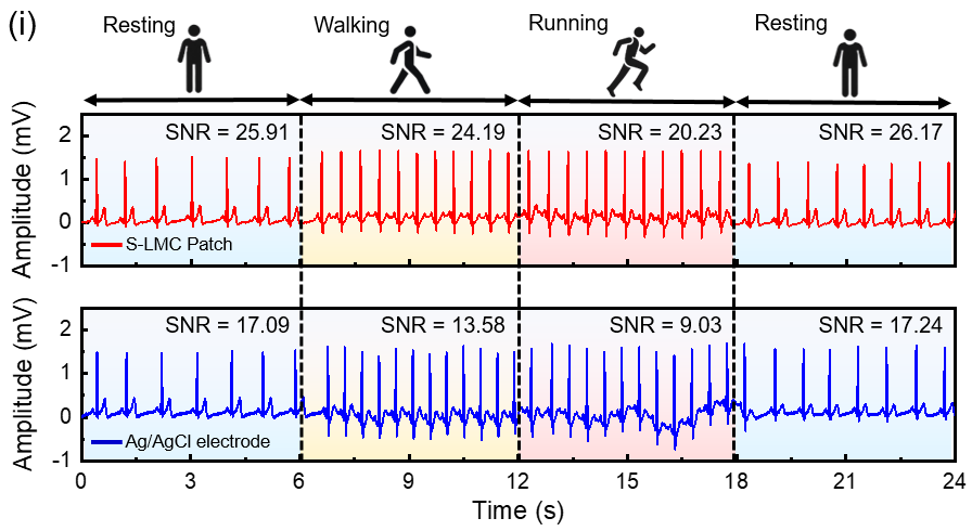 그림3. 움직임에 따른 심전도(ECG) 신호 품질 비교 걷거나 뛰는 격렬한 운동 중에 측정한 심전도 신호 비교. 파란색의 기존 전극(아래)은 움직일 때마다 파형이 심하게 흔들리고 잡음이 섞이는 반면, 빨간색의 개발된 패치(위)는 격렬한 움직임 속에서도 기존 대비 2배 더 선명하고 깨끗한 심전도 신호를 유지함을 확인할 수 있다. |