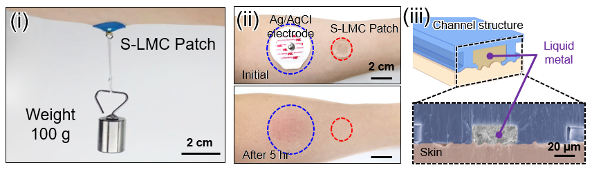 그림2. 피부 부착 성능 및 단면 분석 (i) 화학 접착제 없이도 100g의 무게 추를 거뜬히 버티는 모습. 미세 기둥의 물리적 결합만으로도 강력한 접착력이 발생함을 보여준다. (ii) 장시간 부착 후 피부 비교. 기존 전극(왼쪽)은 떼어낸 자리에 자국이 남았지만, 개발된 패치(오른쪽)는 5시간 후에도 피부 자극이 전혀 없음을 확인했다. (iii) 전자현미경(SEM)으로 촬영한 패치의 단면. 액체금속이 채널 내부에 담겨있고, 개방형 구조 덕분에 피부와 직접 맞닿아 있는 모습을 볼 수 있다. 이 구조 덕분에 전기 저항을 기존의 5분의 1 수준으로 낮출 수 있었다.