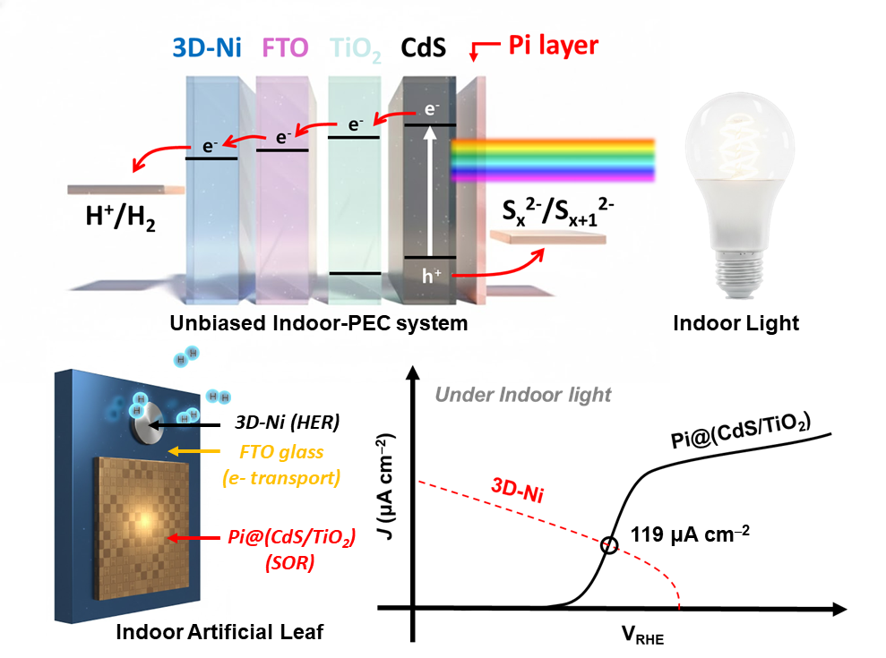 1.연구배경 전 세계 전력 소비의 약 19%는 실내조명으로 사용되고 있다. LED와 형광등 등 실내 조명은 하루 중 장시간 켜져 있고, 일정한 조도와 스펙트럼을 유지한다는 점에서 태양광과 대비되는 잠재적인 에너지원이다. 이번 연구에서는 그간 배터리, 에너지저장장치 집중되었던 실내조명 재활용 연구를 광전극으로 확장하고자 했다. 태양광 기반 광전극은 일사량, 기후, 설치 환경 등 외부 요인에 따라 성능 변동이 크다는 한계를 갖는 반면 오히려 조도와 환경 조건이 상대적으로 안정적인 실내조명이 광전극 시스템을 구동하기에 더 적합한 환경일 수 있다고 판단했다. 2.연구내용 연구팀은 실내 조명 환경에 적합한 광전극 소재를 찾기 위해 여러 광전극을 비교 검토한 결과, 카드뮴 황화물/이산화티타늄(CdS/TiO₂) 광전극이 다른 소재에 비해 실내 조명 조건에서 상대적으로 높은 광전 성능을 보인다는 점에 주목했다. CdS는 가시광선 흡수가 가능해 실내 조명에서도 전하를 만들 수 있고, TiO₂와 결합했을 때 생성된 전하가 비교적 효율적으로 분리·전달되는 특성을 갖는다. 특히 실내 조명처럼 빛의 세기가 낮은 조건에서는 CdS/TiO₂ 광전극 표면에 전하가 과도하게 축적되지 않아, 태양광 조건에서 문제가 되던 급격한 열화가 완화되는 양상이 나타났다. 연구팀은 이러한 특성을 바탕으로 CdS/TiO₂ 광전극의 성능과 안정성을 동시에 끌어올리기 위해 표면에 인산염을 도입한 Pi@(CdS/TiO₂) 광전극을 설계했다. 표면 반응 분석과 이론 계산을 통해, 인산기에 포함된 산소가 광전극 표면에서의 산화 반응을 촉진하고 정공(양전하의 전하입자)이 빠르게 이동할 수 있는 경로를 형성함으로써 전하 전달을 보다 원활하게 만든다는 점을 확인했다. 이어 연구팀은 수소 발생 반응을 담당하는 3차원 니켈(3D-Ni) 촉매를 광전극과 결합해, 외부 전압 없이도 작동하는 무바이어스 광전극 시스템[Pi@(CdS/TiO₂)‖3D-Ni]을 구성했다. 이 시스템을 도선 없이 연결한 인공 나뭇잎 구조로 확장한 뒤 실내 조명 아래에서 구동한 결과, 실제 수소가 안정적으로 생성되는 모습을 확인했다. 나아가 대면적 인공 나뭇잎 4개를 실내 조명용 특수 소켓에 장착해, 일반 실내조명만으로도 지속적인 수소 생산이 가능함을 실험적으로 보여줬다. 3.기대효과 이번 연구는 실내조명을 구동 환경으로 설정한 광전극을 세계 최초로 선보였다. 또 기존 CdS 양자점 기반 광전극이 갖던 안정성 한계를 실내조명 환경을 적용한 역발상과 인산염 코팅을 통해 우회적으로 극복할 수 있음 보여줬다. 특히 대면적 인공 나뭇잎 실험을 통해 실내조명 기반 광전극 시스템이 실험실 수준을 넘어 실제 활용 가능성으로 확장될 수 있음 입증했다는 데 큰 의미가 있다.