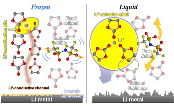 2.연구내용 본 연구에서는 대표적인 탄산염계 유기 용매인 에틸렌 카보네이트(EC)에 주목하였다. EC는 리튬전지에서 널리 사용되는 용매로, 특정 조성 및 조건에서 상온에서도 고체(얼음상)를 형성할 수 있다. 연구진은 EC 결정 구조 내에서 분자 배열과 수소 결합 네트워크를 기반으로 리튬 이온이 이동할 수 있는 잠재적 전도 경로가 존재할 것이라는 가설을 세우고, 이를 이론 계산과 실험을 통해 검증하였다. 그 결과, EC0.2T (0.2 m LiTFSI/EC) 조성의 전해질은 상온에서 고체 상태를 유지하면서도 약 0.64 mS cm⁻¹의 높은 이온 전도도와 리튬 이온 전달수(tLi⁺) 약 0.8을 나타냈다. 이는 잔존 액상에 의존한 전도가 아니라, 고정된 용매 분자로 이루어진 고체 매트릭스 내에서 리튬 이온이 호핑(hopping) 메커니즘을 통해 이동함을 시사한다. 라만 이미지 맵핑 및 열분석 결과, 해당 유기 얼음 전해질은 거시적으로는 고체이며 미시적으로는 고체 매트릭스가 연속적으로 퍼콜레이션(percolation)된 구조를 갖고, 액상은 고립된 포켓 형태로만 존재함이 확인되었다. 또한 전도 기여도 분석을 통해 전체 리튬 이온 전도의 약 70% 이상이 고체 경로에서 기인함을 정량적으로 도출하였다. 이러한 유기 얼음 전해질을 적용한 LFP‖Li 리튬 금속 전지는 400회 이상의 충·방전 사이클 동안 내부 단락 없이 안정적으로 작동하였다. 특히 얼음상 전해질은 용매와 음이온의 이동을 억제하여 부반응을 줄이고, 리튬 금속 표면에는 용매 유래 Li₂O 중심의 안정한 SEI를 형성함으로써 균일한 리튬 도금을 유도하였다. 3.기대효과 본 연구는 “고체화된 유기 전해질은 이온을 전달할 수 없다”는 기존의 고정관념을 깨고, 단일 유기 용매 분자로 이루어진 분자 고체가 전해질로 기능할 수 있음을 최초로 실증했다는 점에서 학문적 의의가 크다. 이는 무기·고분자 네트워크 고체에 국한되었던 전고체 전해질 개념을 분자 고체 영역으로 확장시키는 새로운 패러다임을 제시한다. 특히 본 연구에서 제안한 유기 얼음 전해질은 제조 공정이 단순하고, 특정 온도 범위에서는 고체 전해질로, 그 이상에서는 액체 전해질로 작동할 수 있는 이중 기능 전해질로의 확장 가능성을 지닌다. 이는 저온 환경에서의 배터리 작동, 안전성 향상, 리튬 금속 전지의 수명 연장에 기여할 수 있다. 궁극적으로 본 연구는 전해질 설계의 새로운 방향성을 제시하며, 탄산염을 넘어 다양한 유기 용매 기반 분자 고체 전해질로 개념을 확장함으로써 차세대 고안전·고신뢰성 배터리 기술 개발의 기반을 마련할 것으로 기대된다.