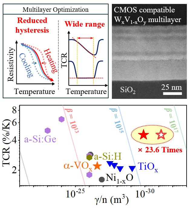 그림2. 다층 바나듐산화물의 이력 현상 감소와 종합 성능 향상 실험 결과 (상단 좌측) 텅스텐 함량이 서로 다른 이산화바나듐 박막을 적층해 이력 현상을 줄이고, 넓은 온도 구간에서 높은 온도 민감도(TCR)를 유지한 결과. 가열과 냉각 과정에서의 저항 차이가 줄어들고, 온도 변화에 따른 응답이보다 직선에 가깝게 개선 됐다. (상단 우측) 300℃ 공정으로 실리콘 기판 위에 증착된 텅스텐 도핑 이산화바나듐 다층 박막의 단면 이미지. 기존 반도체 회로(CMOS) 위에 직접 증착이 가능하다. (하단) 다양한 상용 소재와의 종합 성능 비교 그래프. 온도 민감도와 신호의 정확성·신뢰도를 함께 고려한 종합 성능 지표에서 기존 상용 소재 대비 최대 23.6배 향상된 값을 기록했다. |