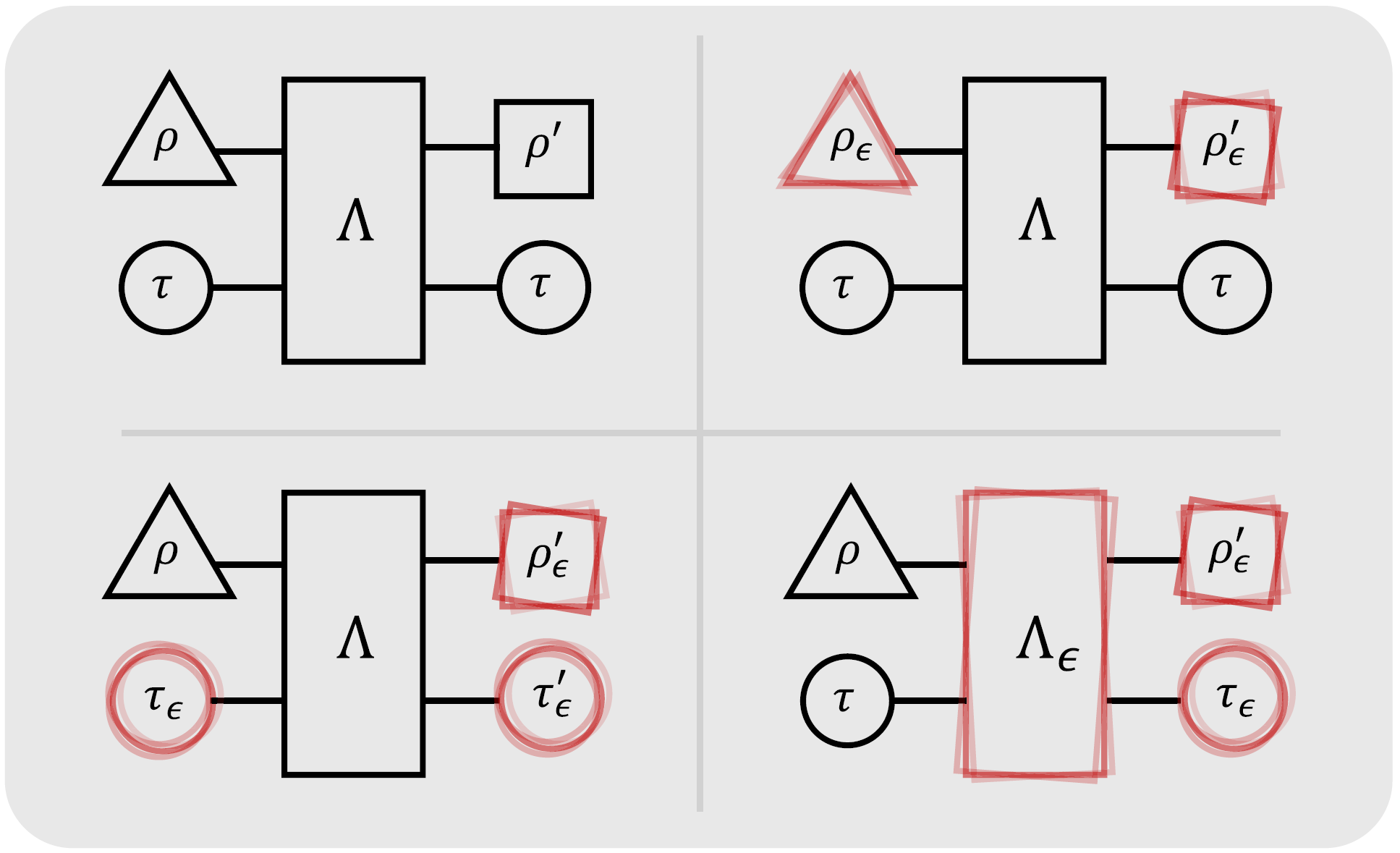 그림설명. 외부 잡음에 따라 달라지는 양자 촉매 과정 (좌상) 양자 촉매 을 활용하여 양자 상태 를 으로 변화시키는 촉매 과정. (우상) 초기 양자 상태에 오류가 있더라도 그 오류를 촉매로 전파하지 않는 오류 내성 촉매 과정. (좌하) 초기 촉매 상태에 오류가 있을 때 촉매 반응물에 그 오류가 전파된 비이상적인 촉매 과정. (우하) 초기 상태와 촉매 상태 모두 완벽하나 촉매과정 자체에 오류가 있을 때 촉매 반응물과 양자 촉매 모두 오류에 오염된 비이상적인 과정. |