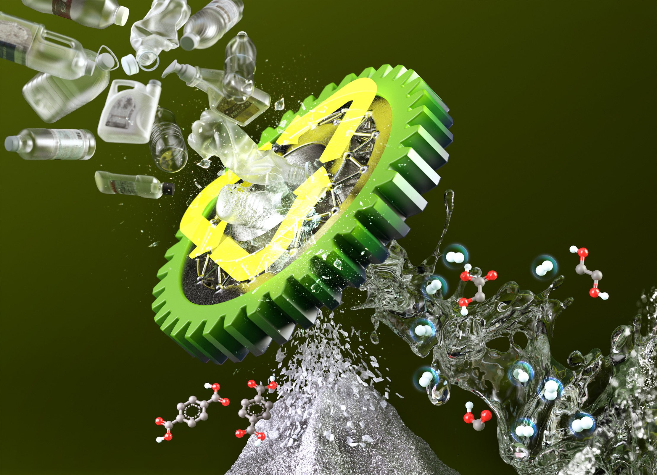 그림1. 영국왕립학회가 발행하는 저널인 ‘Green Chemistry’의 표지 이미지. 다기능성 폴리옥소메탈레이트(PMA) 촉매를 활용해 폐페트(PET)병을 고순도 화학 원료와 친환경 수소 및 전기에너지로 전환하는 순환 경제 시스템을 묘사했다.