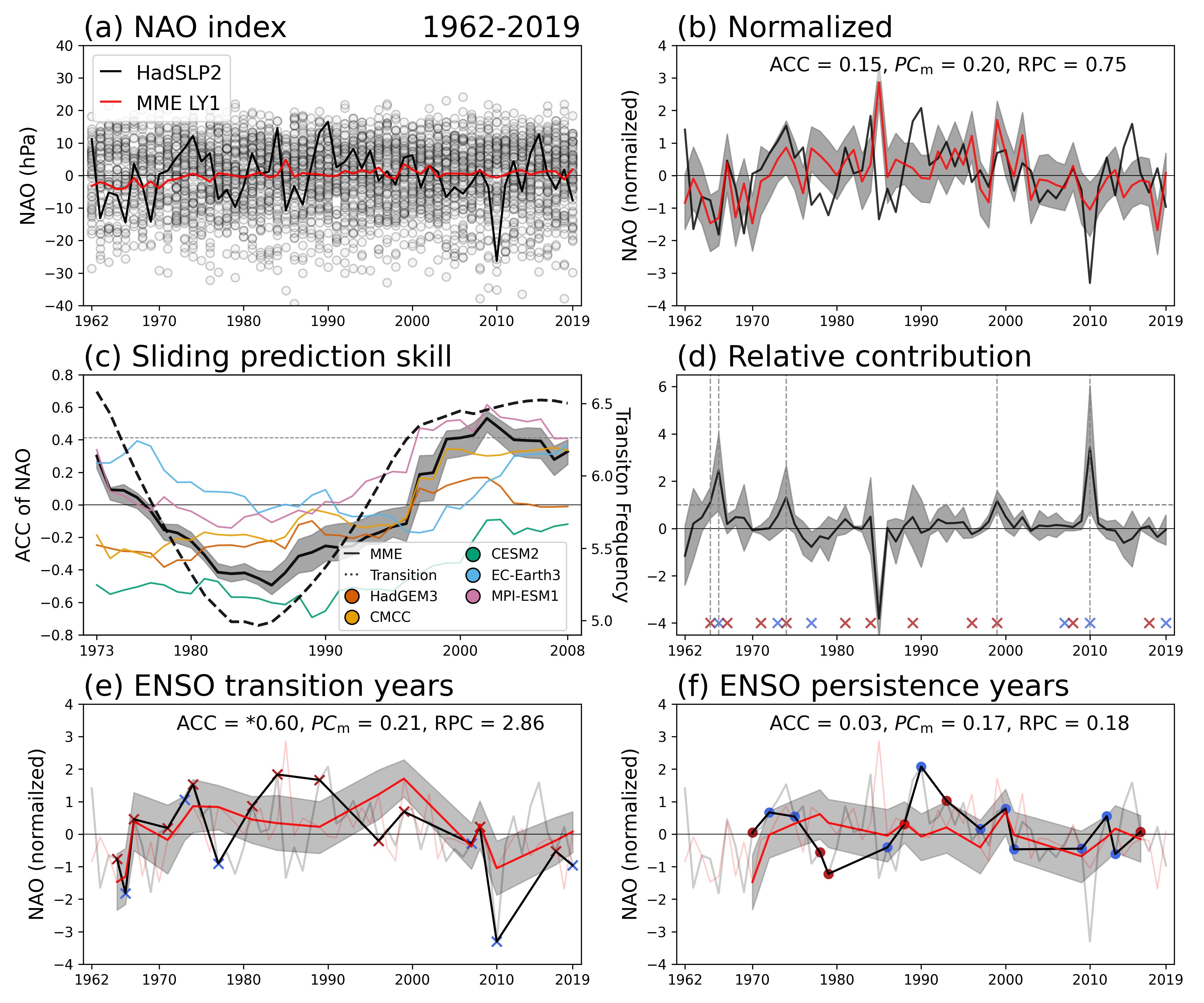 그림 1. 계절 기후 예측 시스템의 다중모델 앙상블을 이용한 북대서양진동(NAO)의 1년 후 예측 성능 분석 결과. (a) 1962~2019년 동안 실제 관측된 북대서양진동 지수(검정선)와 여러 기후 모델 결과를 평균한 다중모델 앙상블(MME) 예측값(빨간선)을 비교한 그래프.(b) NAO 지수를 정규화해 나타낸 분포로, 모델 예측값과 실제 관측값의 전반적인 일치 정도를 보여준다.(c) 개별 기후 모델(색선)과 다중모델 앙상블 평균(MME, 검정선)의 1년 후 NAO 예측 성능의 장기 변화를 23년간 이동 평균으로 나타낸 결과. 단기적인 변동을 줄이고 장기적인 예측 성능 변화를 확인하기 위해 23년 구간 평균을 이동시키며 계산했다.(d) 다중모델 앙상블(MME)의 1년 후 NAO 예측 성능에 각 연도가 얼마나 기여했는지를 나타낸 결과로, 특정 해에 예측 신호가 강하게 나타나는지를 보여준다.(e) 엘니뇨와 라니냐가 서로 바뀌는 전환 해에 대한 정규화된 NAO 지수 시계열과 예측 결과. 이 경우 1년 후 NAO 예측 성능이 상대적으로 높게 나타난다. (f) 엘니뇨 또는 라니냐 상태가 계속 유지된 ENSO 위상 유지 해에 대한 정규화된 NAO 지수 시계열과 예측 결과. 전환 해에 비해 NAO 예측 성능이 낮은 경향을 보여준다.