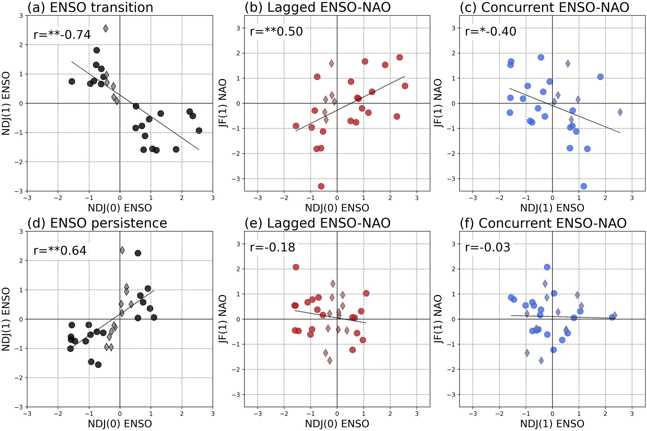 그림 2. 엘니뇨·라니냐 전환 시 나타나는 ‘1년 지연 효과’와 ‘즉각 효과’의 시너지(보강간섭) (a) 관측 엘니뇨-남방진동(ENSO) 위상 전환 내 ENSO와 1년 후 ENSO 간의 산포도와 선형 관계.(b) 같은 위상 전환 내 ENSO와 1년 후 NAO 간의 1년 지연 상관 산포도.(c) 같은 위상 전환 내 1년 후 ENSO와 1년 후 NAO 간의 동시 상관 산포도.(d)-(f) ENSO 위상 지속 기간에 대해 (a)-(c)와 동일한 분석.