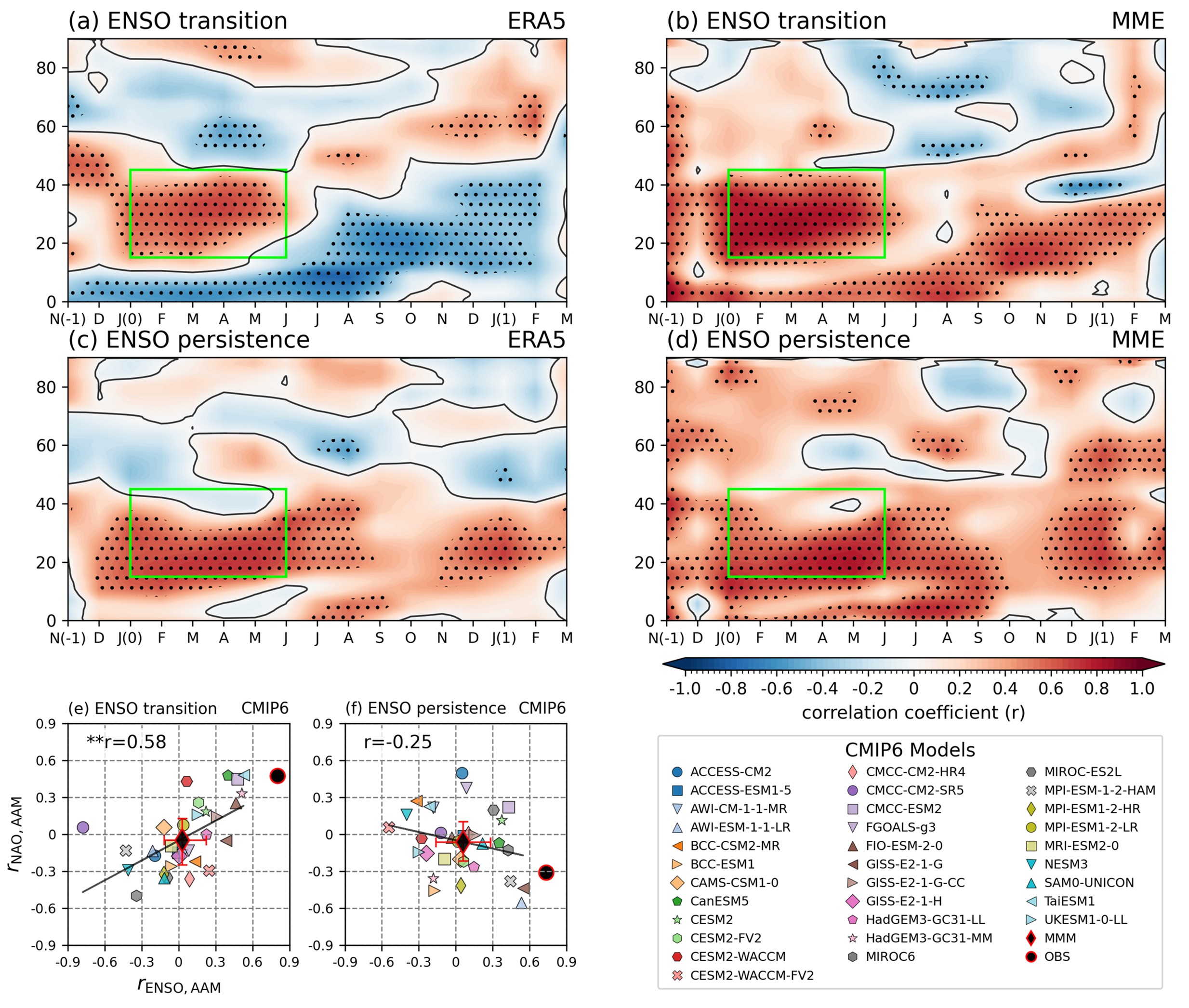 그림 3. 엘니뇨·라니냐 전환 시 적도에서 시작된 대기 각운동량(AAM) 변화가 북반구로 전달되는 과정 (a) 관측 내 ENSO 위상 전환 내 ENSO 지수와 북반구 지역의 대기 각운동량(AAM) 간의 월별 시차 상관관계.(b) ENSO 위상 전환 내 다중 모델 앙상블(MME) 평균의 AAM의 예측 성능.(c)-(d) ENSO 위상 지속 기간 내 (a)-(b)와 동일한 분석.(e) CMIP6 과거 시뮬레이션을 이용한 모델 별 ENSO 전환기 내 ENSO와 AAM 간의 상관관계(x축)와 AAM과 1년 후 NAO 간의 상관관계(y축)의 산포도. 검은색 원은 관측값을, 검은색 마름모는 MME를 나타냄. AAM 지수는 (a)-(e)의 초록 박스 평균.(f) ENSO 위상 지속 기간 내 (e)와 동일한 분석. |