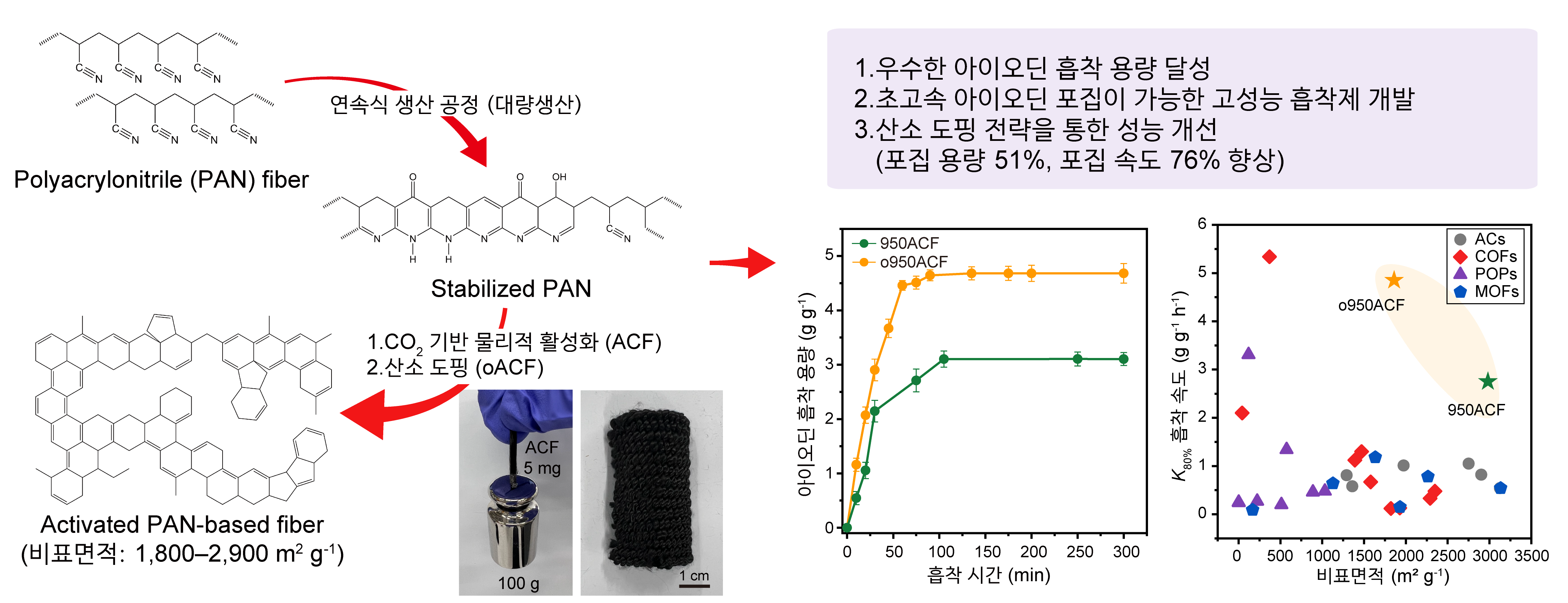 그림설명. 초고다공성 활성탄 섬유를 이용한 방사성 요오드 포집 기술 실처럼 생긴 폴리아크릴로니트릴(PAN) 섬유를 여러 번 가열해 안정화시킨 뒤 이산화탄소 기체를 주입해 표면을 조금씩 깎아내면 섬유 내부에 아주 작은 구멍들이 촘촘히 생긴다. 여기에 산소 처리를 더하면 기공이 요오드를 더 잘 끌어당기는 성질이 생긴다. 같은 소재라도 산소 처리를 하지 않은 경우보다 요오드를 더 많이, 더 빠르게 흡착할 수 있었다. 실제로 실험에서는 요오드 흡착량과 속도가 각각 1.5배, 1.7배 증가했다. 오른쪽 그래프는 이런 차이를 보여준다. 개발된 소재는 기존 활성탄이나 다른 다공성 흡착 소재보다 요오드를 더 빨리 빨아들이면서도, 더 많은 양을 한 번에 붙잡을 수 있는 것으로 나타났다. |
